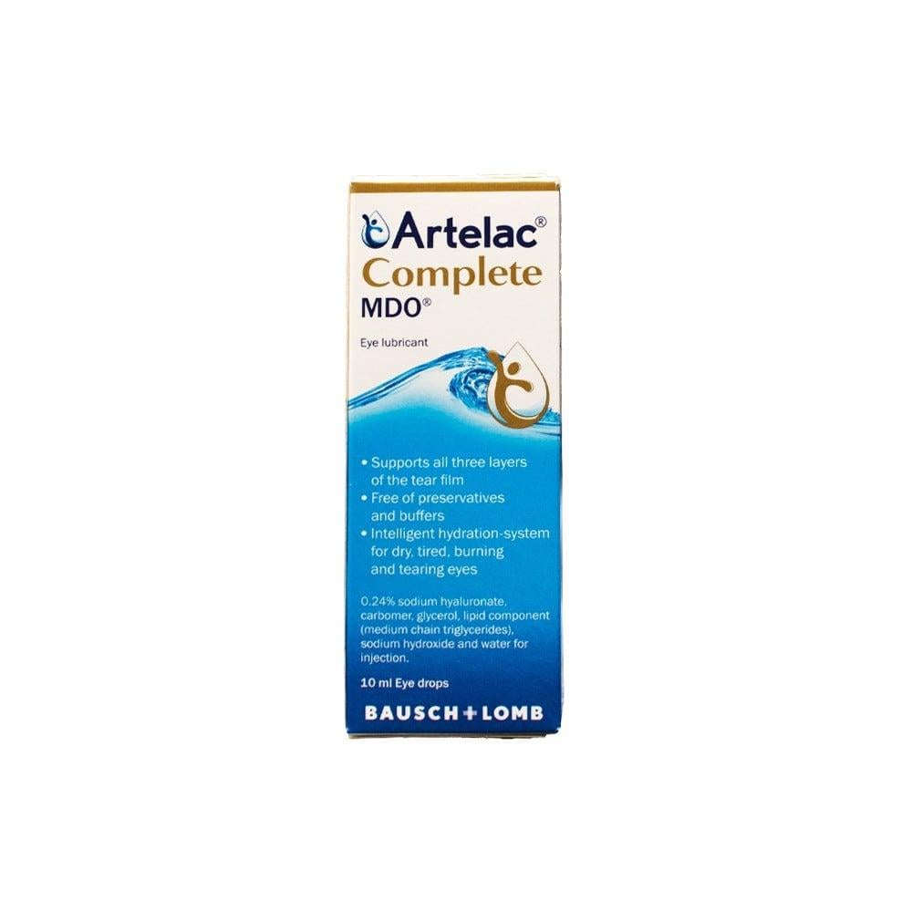 أرتيلاك كومبليت إم دي او هو محلول قطرات عين معتم يحتوي على 0.24 % حمض هيالورونيك (في صورة هيالورونات الصوديوم) وكربومير وغليسيرُول ومكون دهني (جليسريدات ثلاثية متوسطة الحلقات) وهيدروكسيد الصوديوم ومياه للحقن.