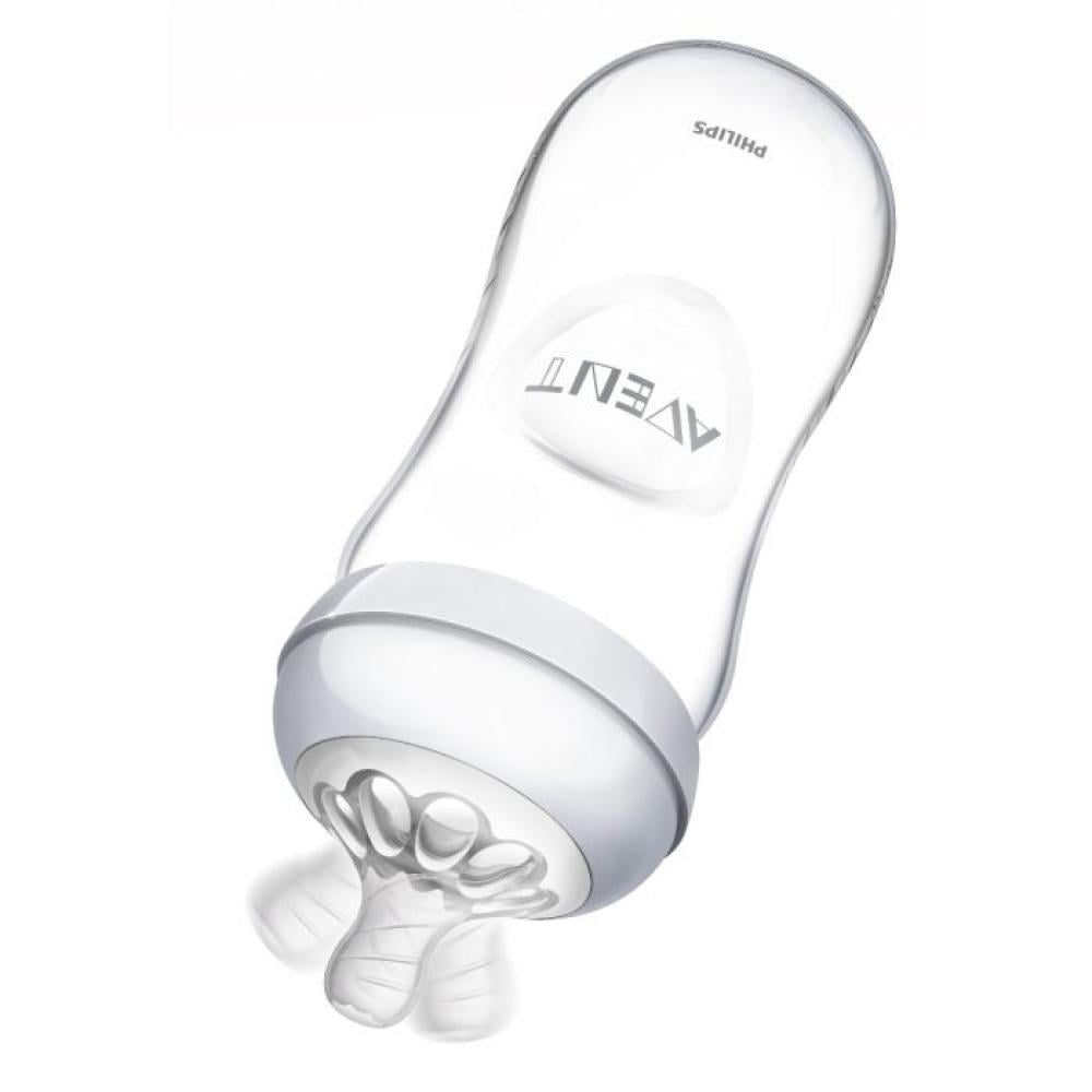رضاعة زجاجية من فيلبس افنت تحتوى على حلمة ذات ملمس فائق النعومة مصمم لتقليد ملمس ثدى الام مع تصميم حلزونة مرن جنبا الى جنب مع بتبات الراحة الفريدة مما يسمح بتغذية طبيعية بشكل أكبر دون انقباض الحلمة.