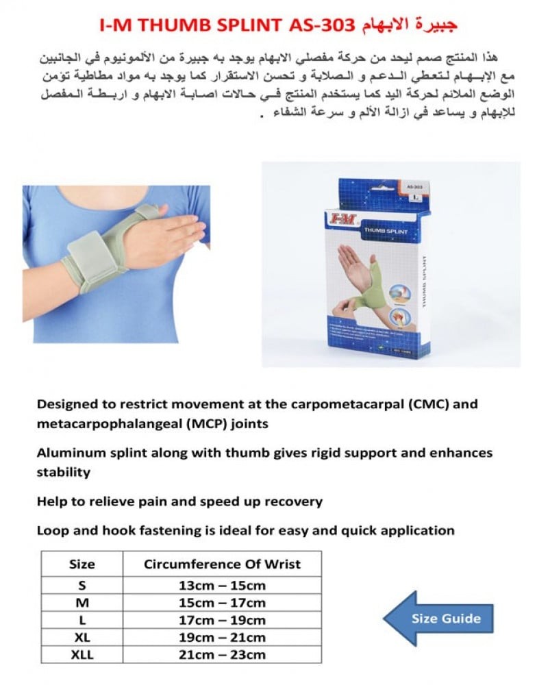 كما يستخدم المنتج في حالات اصابة الابهام واربطة المفصل للإبهام