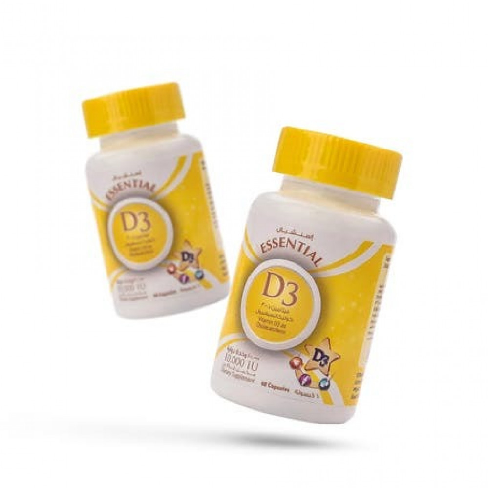 - إسنشيال فيتامين د 3 هو عبارة عن كبسولات مكملة غذائية تحتوي على فيتامين د 3.