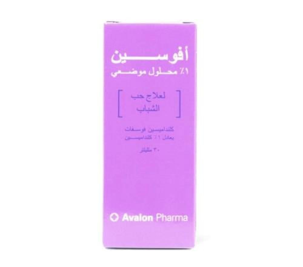 - افوكسين 1% محلول موضعي 30 مل، الغرض من هذا الدواء هو علاج حب الشباب كما يساعد في تقليل كمية آثار حب الشباب.