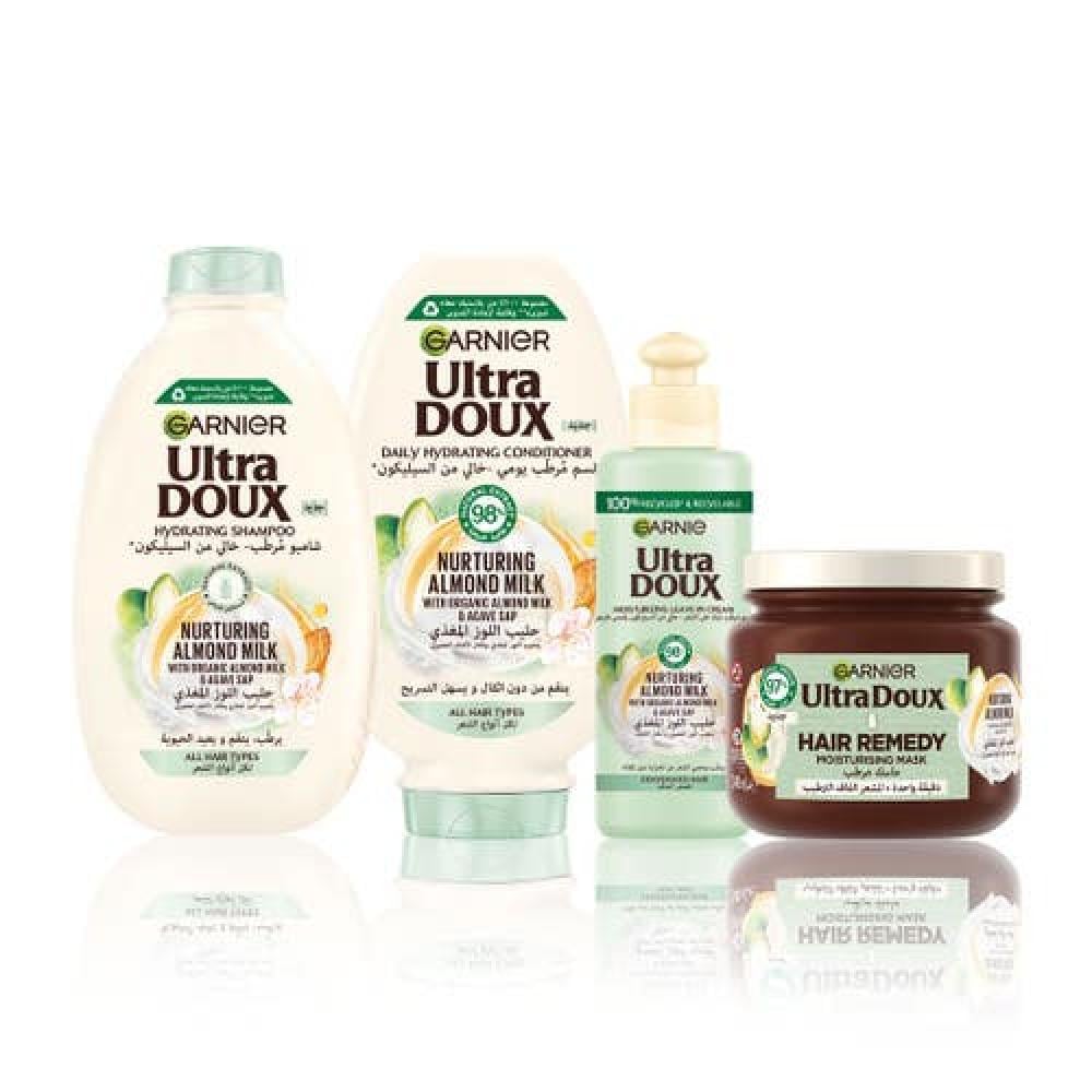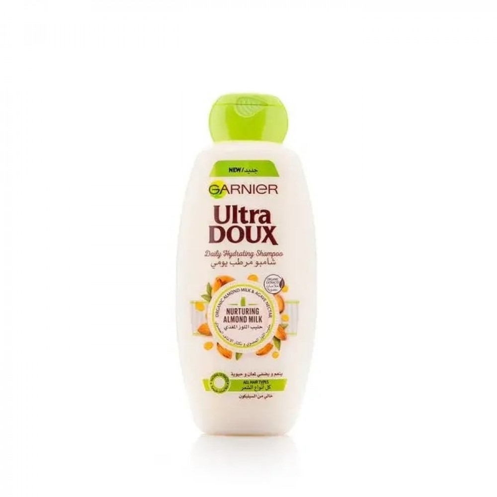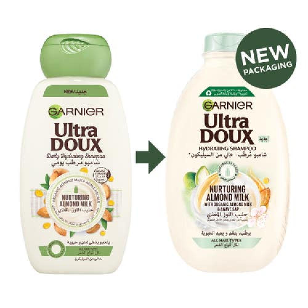 غارنييه الترا دو شامبو حليب اللوز المغذي يجمع حليب اللوز العضوي: كنز غذائي حقيقي لترطيب الشعر بعمق من دون إثقاله، و نكتار الأغاف: يلقب "بالعسل الجديد"، فمثل العسل هو خفيف و صحي