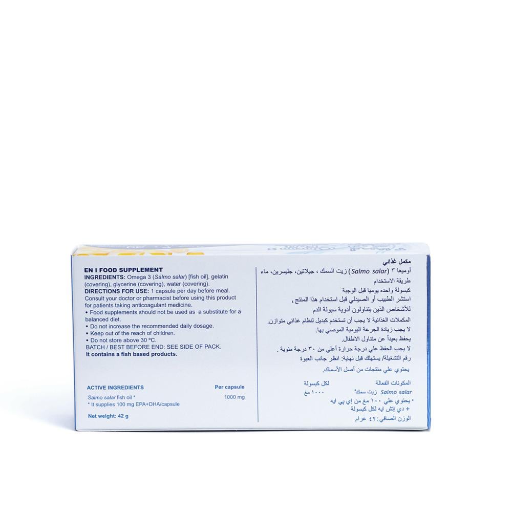 الأحماض الدهنية أوميغا 3 هي مغذيات "ضرورية". ومع ذلك، فإن الجسم غير قادر على إنتاج الأحماض الدهنية أوميغا 3 الخاصة به. لذلك، يحتاج كل شخص إلى الأحماض الدهنية أوميغا 3 في حياته، ويمكن لكل شخص أن يأخذ مكمل أوميغا 3. مكملات أوميغا 3 مناسبة للأشخاص المهتمين بالحفاظ على قلب ودماغ ورؤية صحية، وهم قادرون على الاستفادة من تناول كمية منظمة من مكملات أوميغا 3. يتميز منتج أوميغا 3 فورت باستخراجه بطريقة خاصة من السلمون للحفاظ على خواصه الضرورية وضمان أنه لا يحتوي على أي شوائب ضارة للجسم. كما يتيمرزبأنه يحتوي على مركز بوزن 1000 ملغ لكل كبسولة ونسبة مناسبة من اي بي ايه ودي اتش ايه يوصى باستخدام كبسولة واحدة يوميًا أو حسب تعليمات الطبيب