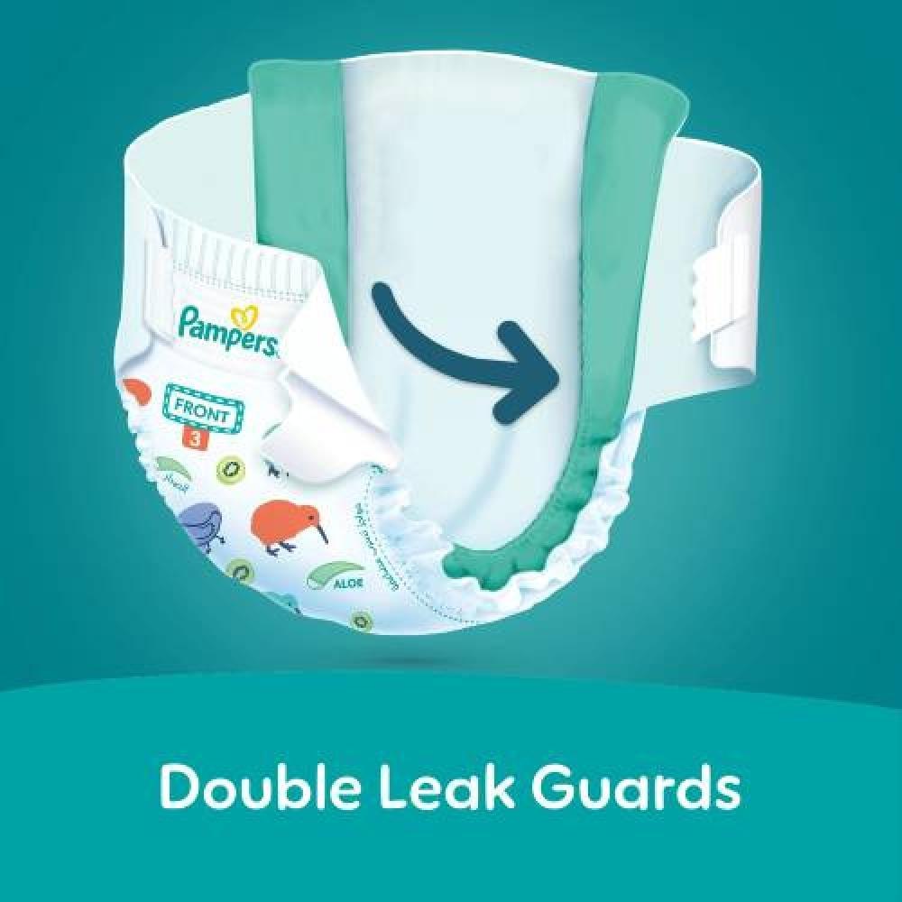 - جديد ومطور، بامبرز بيبي دراي الآن أصبح بامبرز حماية من التسلخات. يحدث التسرب عادةً بسبب حجم الحفاض غير المناسب، مما يؤدي إلى تهيج البشرة.