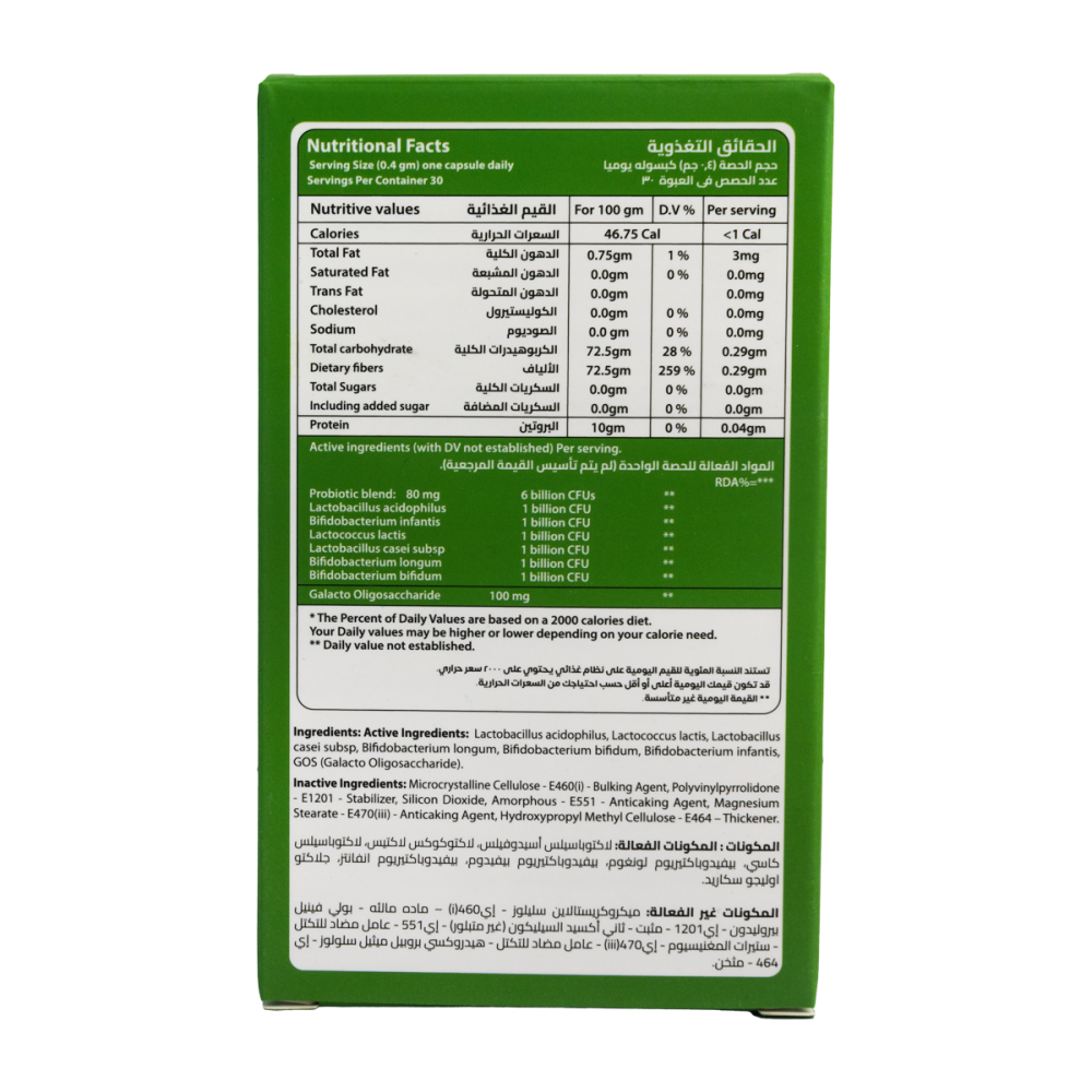 ولضمان نمو وازدهار هذه البكتيريا النافعة، تم تعزيز التركيبة بـ 100 مجم من ألياف الجلاكتو-أوليجوساكاريد (GOS)، وهي ألياف بريبيوتيك تعمل كغذاء مخصص لدعم هذه البكتيريا، مما يساعد على تحقيق أقصى استفادة من البروبيوتيك.