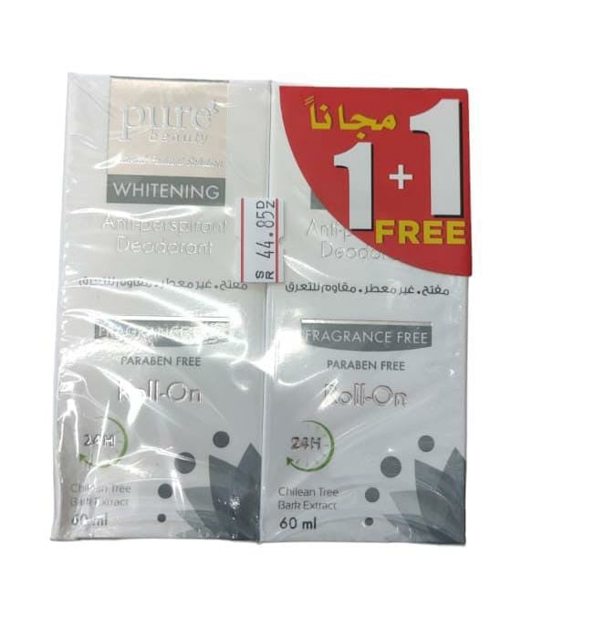 بيور بيوتي مزيل عرق رول مفتح غير معطر ومقاوم للتعرق - 60 + 60مل حبة وحبة مجانا Pure Beauty