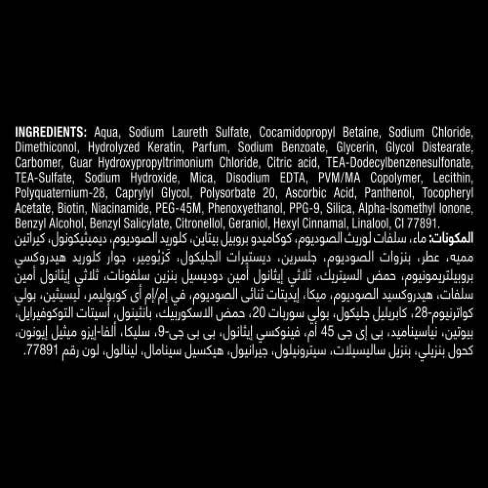 ماء، سلفات لوريث الصوديوم، كوكاميدو بروبيل بيتاين، كلوريد الصوديوم، ديميثيكونول، كيراتين مميه، عطر، بنزوات الصوديوم، جلسرين، ديستيرات الجليكول، كَرْبُومِير، جوار كلوريد هيدروكسي بروبيلتريمونيوم، حمض السيتريك، ثلاثي إيثانول أمين دوديسيل بنزين سلفونات، ثلاثي إيثانول أمين سلفات، هيدروكسيد الصوديوم، ميكا، إيديتات ثنائى الصوديوم، في إم/إم أى كوبوليمر ، ليسيثين، بولي كواترنيوم-28، كابريليل جليكول، بولي سوربات 20، حمض الاسكوربيك، بانثينول، أسيتات التوكوفيرايل، بيوتين، نياسيناميد، بى إى جى 45 أم، فينوكسي إيثانول، بى بى جى-9، سليكا، ألفا-إيزو ميثيل إيونون، كحول بنزيلي، بنزيل ساليسيلات، سيترونيلول، جيرانيول، هيكسيل سينامال، لينالول، لون رقم 77891.