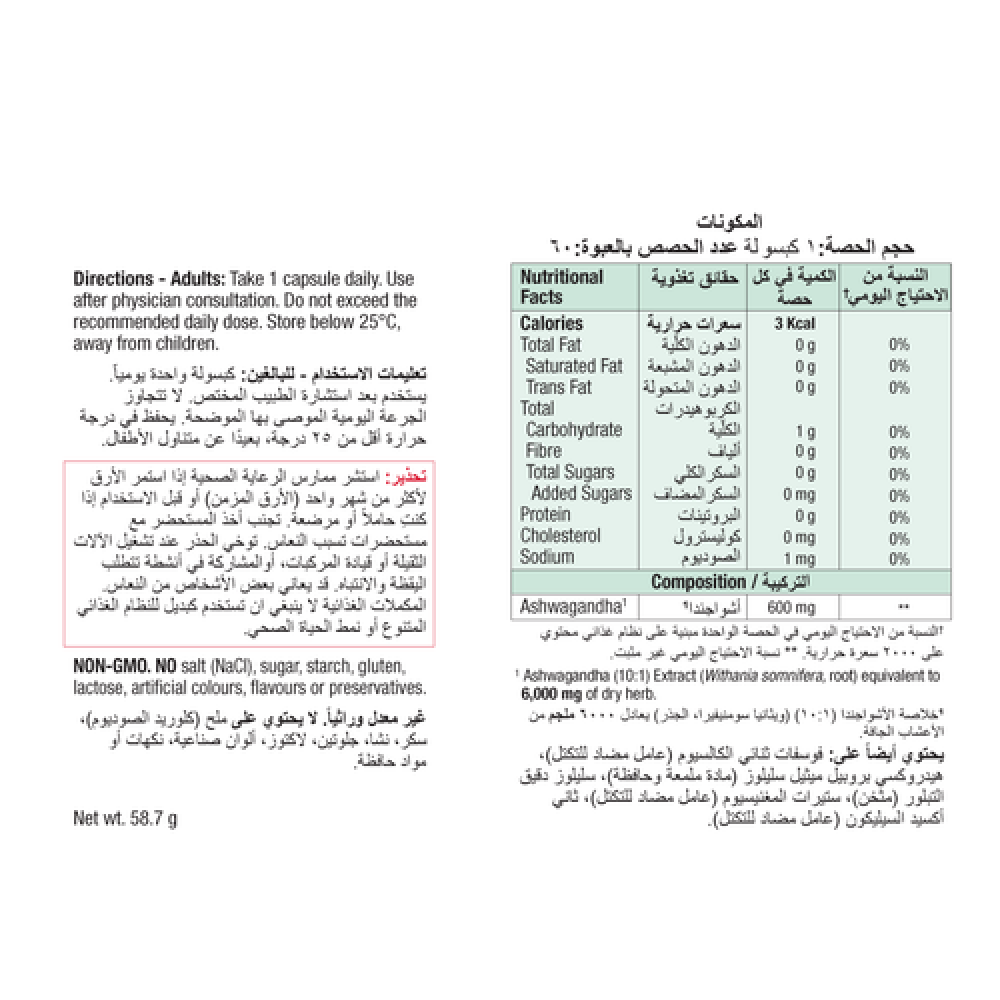 - مستخلص أشواغاندا (10:1) 600 مجم (ما يعادل 6000 مجم من الأعشاب المجففة)، فوسفات الديكالسيوم، سليلوز قابل للذوبان في الماء، سليلوز، ستيرات المغنيسيوم النباتية، وسيليكا