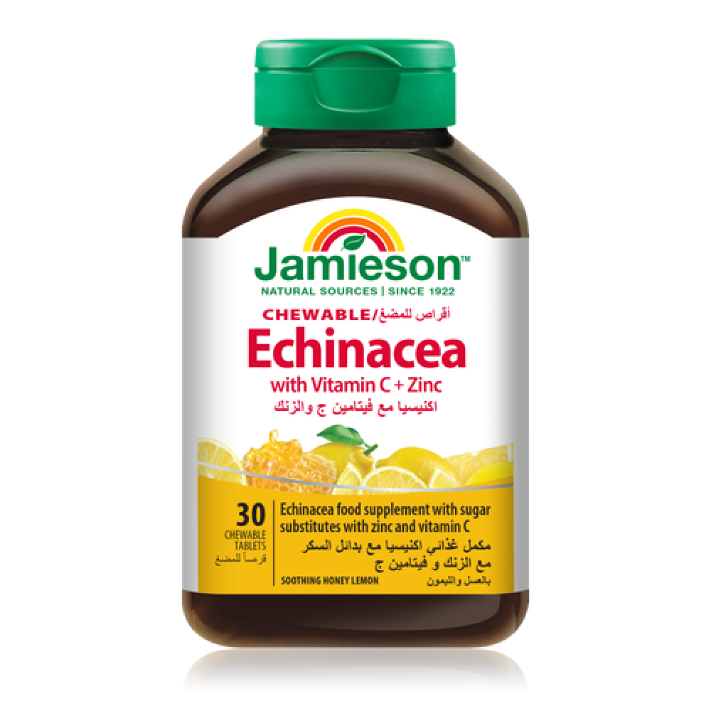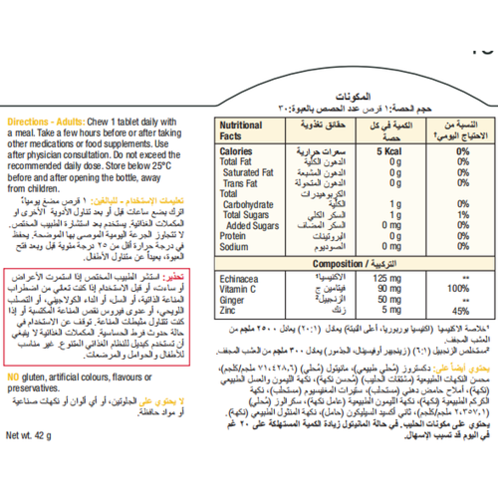 - فيتامين C والزنك بين أربعة مكونات طبيعية لمكافحة البرد، كل ذلك في قرص واحد قابل للمضغ يوميًا، للمساعدة في تعزيز جهاز المناعة لديك ومحاربة نزلات البرد والإنفلونزا.