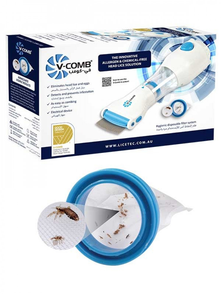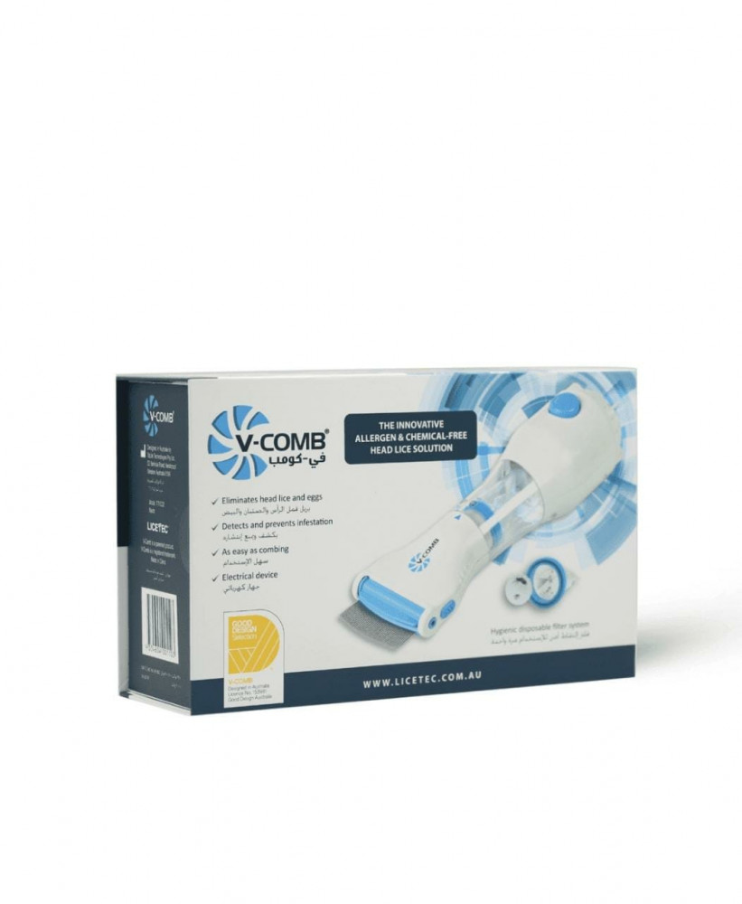 إن V-Comb ™ هي طريقة فيزيائية آمنة وقابلة لإعادة الاستخدام للقضاء على القمل والصئبان لكل من الأطفال والبالغين باستخدام نظام شفط طبيعي.