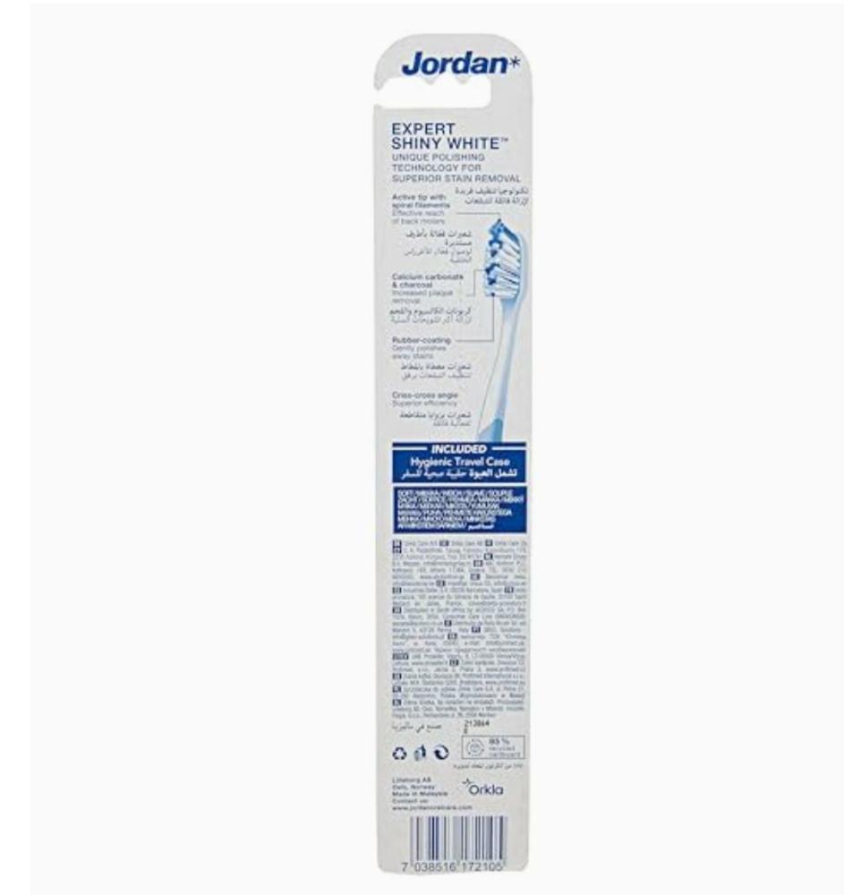 تحتوي فرشاة الأسنان شايني وايت من جوردان على \"نظام تبييض\" من خطوتين، فعال في إزالة البقع اليومية دون أي مواد كيميائية ضارة. تعمل شعيرات وايت تيك على إزالة البقع المتراكمة اليومية الناتجة عن تناول المشروبات مثل الشاي أو القهوة أو عصائر الفاكهة. تعمل أداة التلميع الموجودة على الجزء الخلفي من الرأس على تلميع أسنانك بلطف بعد التنظيف مما يجعلها لامعة وبيضاء بشكل طبيعي. يمكنك الاختيار من بين الشعيرات الناعمة أو المتوسطة، كما تأتي بـ5 ألوان متنوعة.