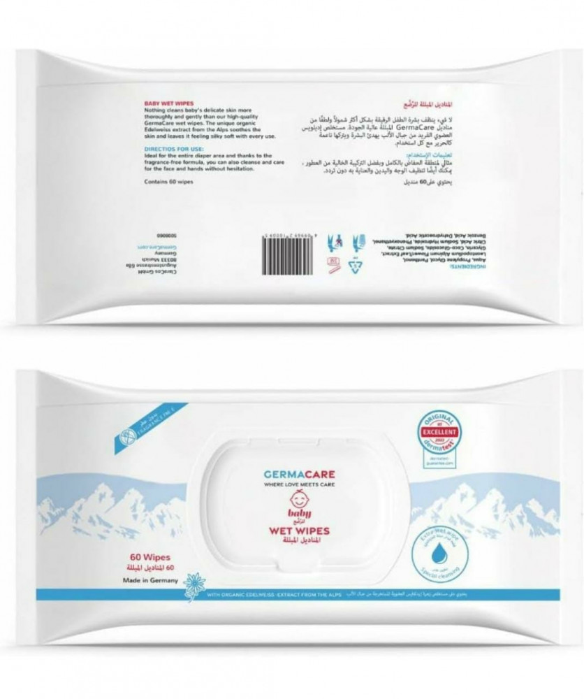 لا شيء ينظف بشرة الطفل الرقيقة بشكل جيد ولطيف أكثر من مناديل GermaCare المبللة عالية الجودة.
