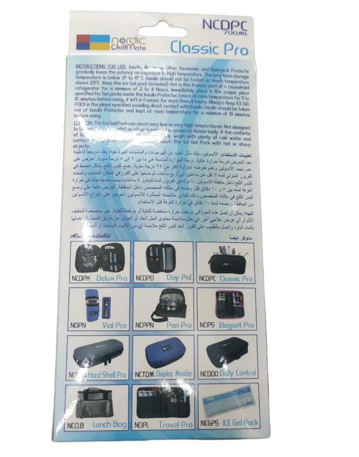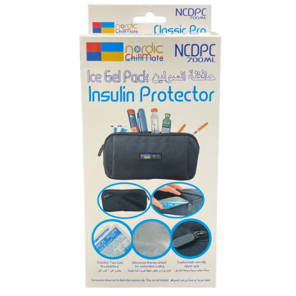 مصنوعه من جاجز واقي عازل للحرارة بالإضافه إلى 2 كيس ثلجي . هذا سوف يحمي الأنسولين وغيرها من المنتجات المماثلة من التلف عن طريق التعرض لارتفاع درجة الحرارة والمحافظه على البرودة لفترة طويله .