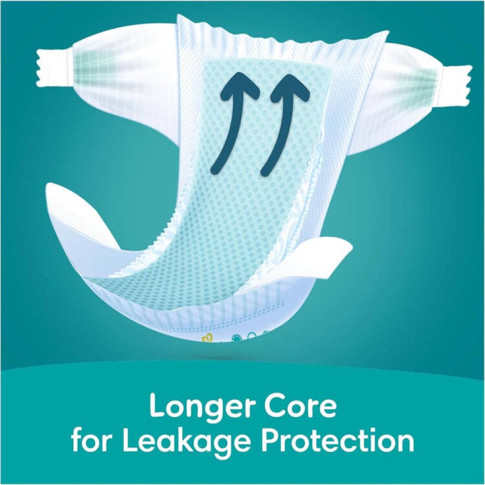 - ثلاث قنوات امتصاص توزع البلل بالتساوي وتحبسه بشكل أفضل، باستخدام الحفاض الكامل من الأمام إلى الخلف لحماية تصل إلى 100٪ من التسرب و13 ساعة من الجفاف.
