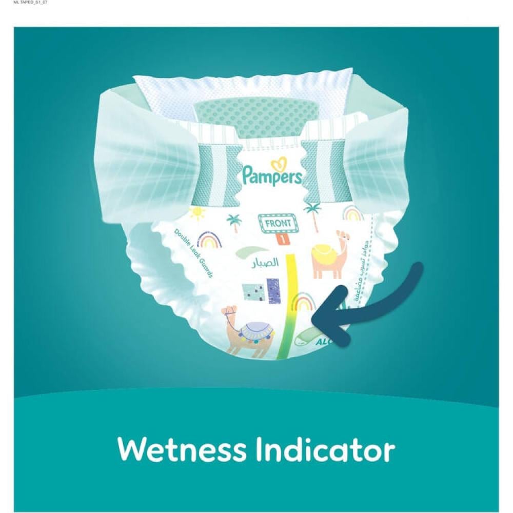 - صُنعت هذه الحفاضات من بامبرز بميزات ستحبونها أنتم وأطفالكم، وتأتي بمؤشر للبلل يتحول ببساطة من اللون الأصفر إلى الأزرق، لتعرفوا دائمًا متى يحين الوقت لتغيير الحفاضة.