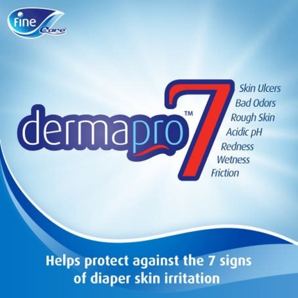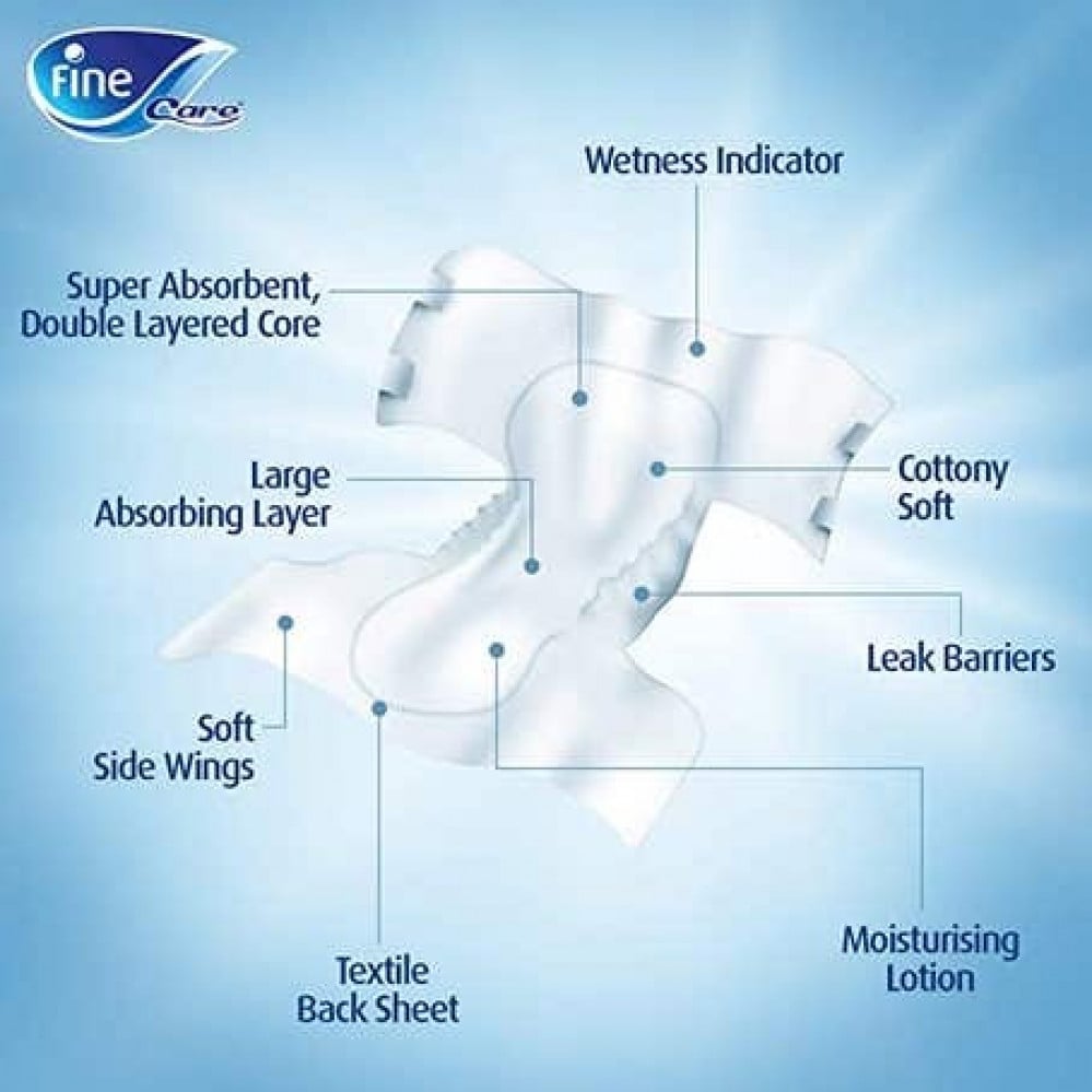 - حفاضات فاين كير للبالغين ، بتقنية ديرمابرو 7 الحاصلة على براءة اختراع ، توفر امتصاصًا مثاليًا وراحة طوال النهار والليل ، لأنها مصممة خصيصًا لتناسب محيط الجسم.