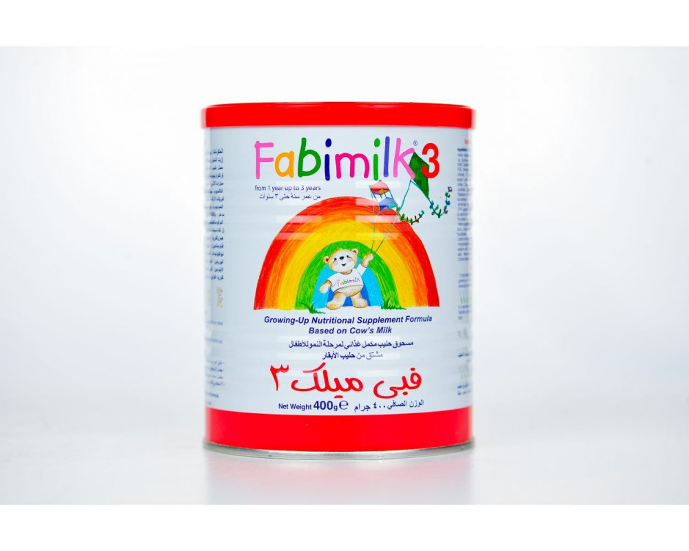 - تركيبة حليب الأطفال التي تعتمد على حليب البقر ، خالية من السكروز للأطفال الصغار (من 1 إلى 3 سنوات) وتحفيز الشهية وضمان حصول الطفل على العناصر الغذائية الضرورية. ثلاثة أكواب في اليوم من فابيميلك 3 تلبي المتطلبات الغذائية للطفل مع السماح له أو لها بتجربة الطعام الصلب في نفس الوقت.