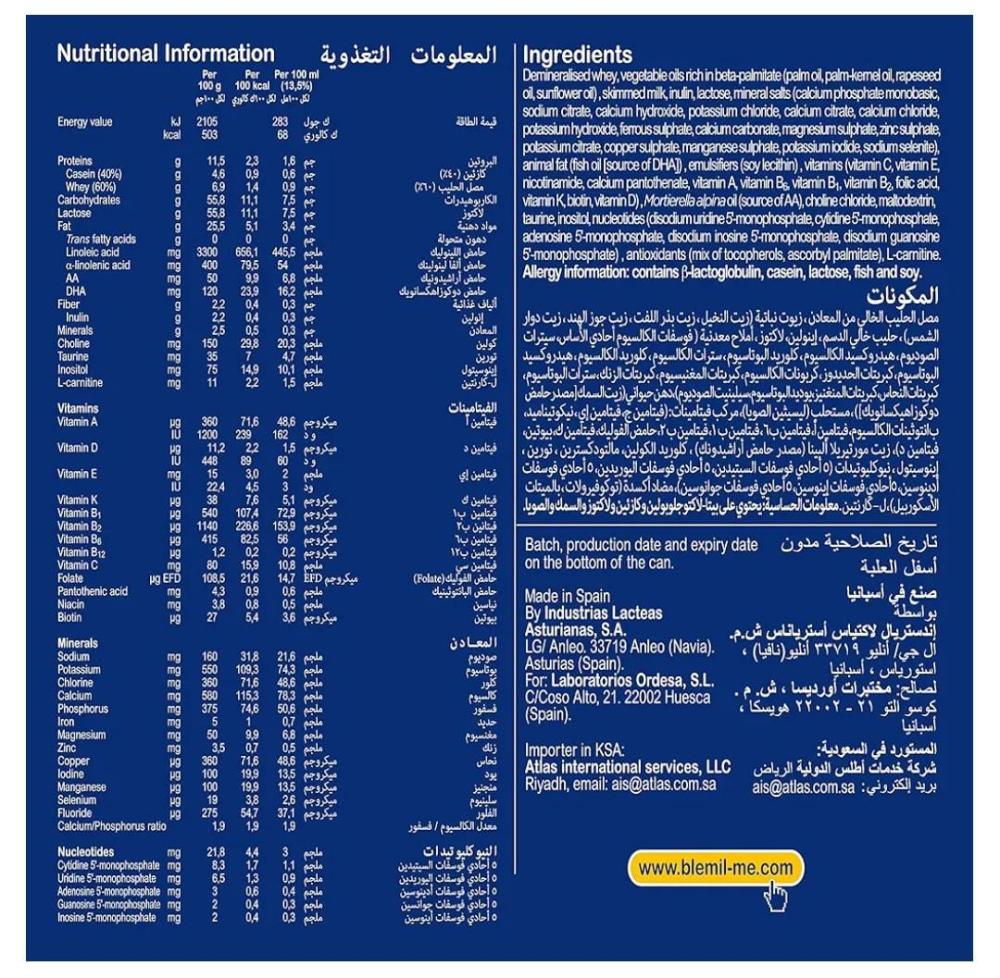 أوميجا 3، أوميجا 6 الأحماض الدهنية المتعددة غير المشبعة طويلة السلسلة (DHA وARHA)، النيوكليوتيدات، الزنك، بروتينات مصل اللبن/الكازين (65/35)، التورين، الكارنيتين، الكربوهيدرات، حمض الدوكوساهيكسينويك، حمض الأراكيدونيك، السيلينيوم وفيتامين E.