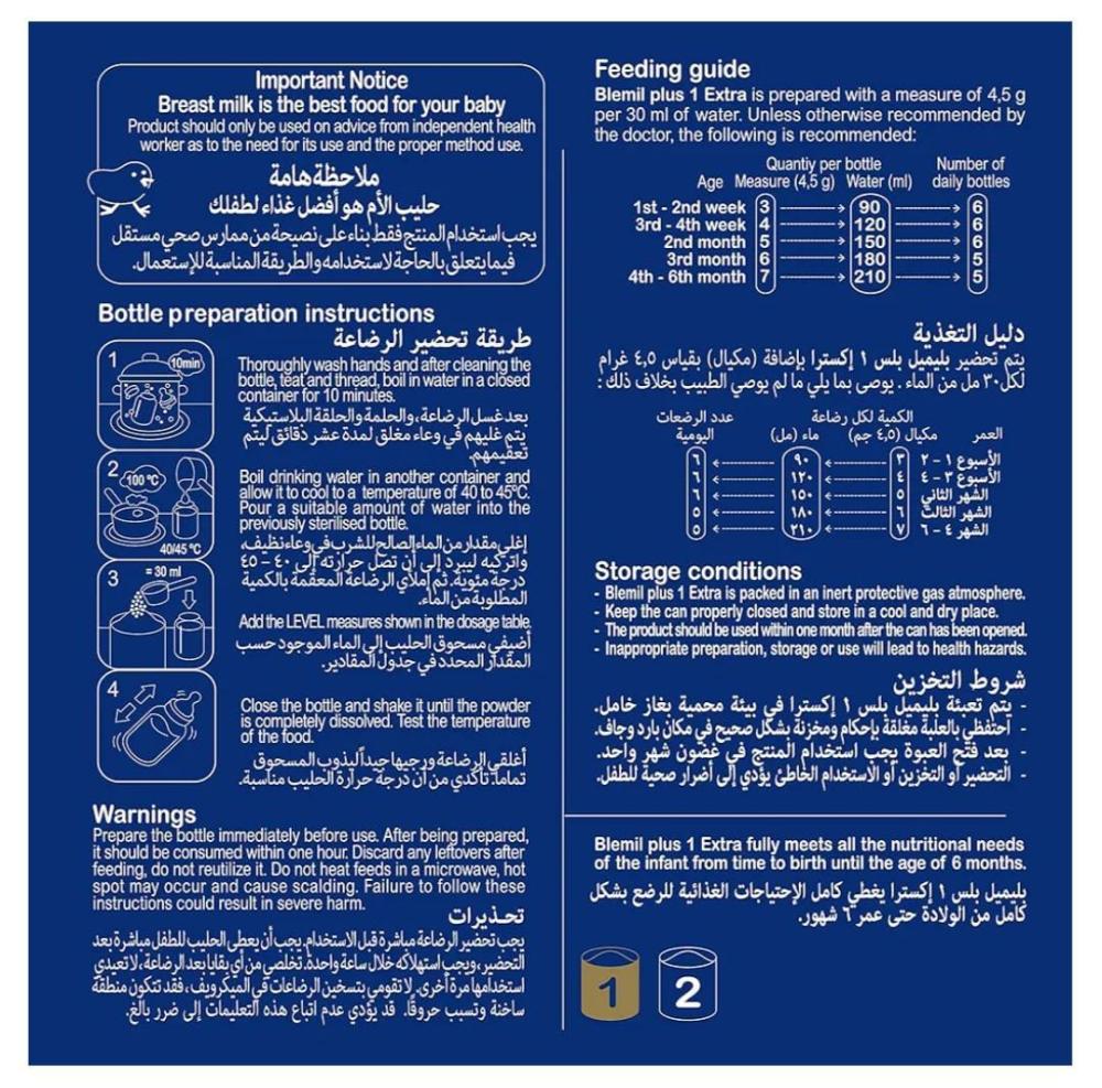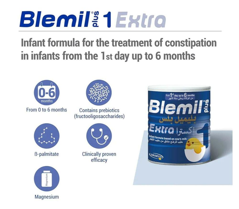 يمكن استخدام حليب متابعة بليميل بلس اكسترا 1 كمصدر غذاء وحيد للأطفال الرضع من عمر 6 إلى 12 شهراً منتج خاص بالأطفال المعرضين للإمساك، والذي يحدث عادةً أثناء الانتقال من الرضاعة الطبيعية إلى الرضاعة الصناعية. منتج مصنوع من حمض البالمتيك بنسبة 45% (بيتا بالميت) يسهل امتصاص الدهون والكالسيوم والمغنيسيوم، ويقلل من صلابة البراز وبالتالي الإمساك. تساهم سلسلة سكريات فركتوليغوساكاريد الطويلة والقصيرة في نمو الجهاز الهضمي وتنظيم نقل الطعام في الأمعاء. يحفز الجهاز المناعي ويدعم نمو البكتيريا النافعة. تحتوي العبوة على سعة 600 غرام.