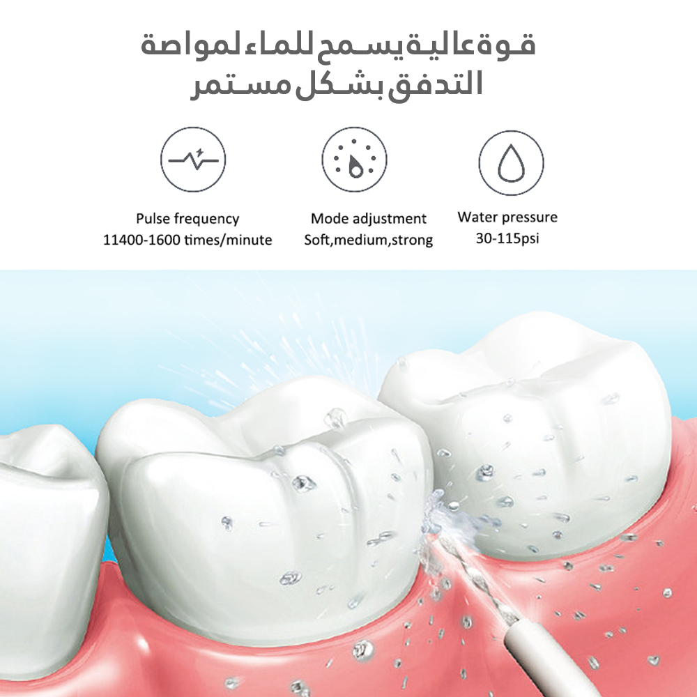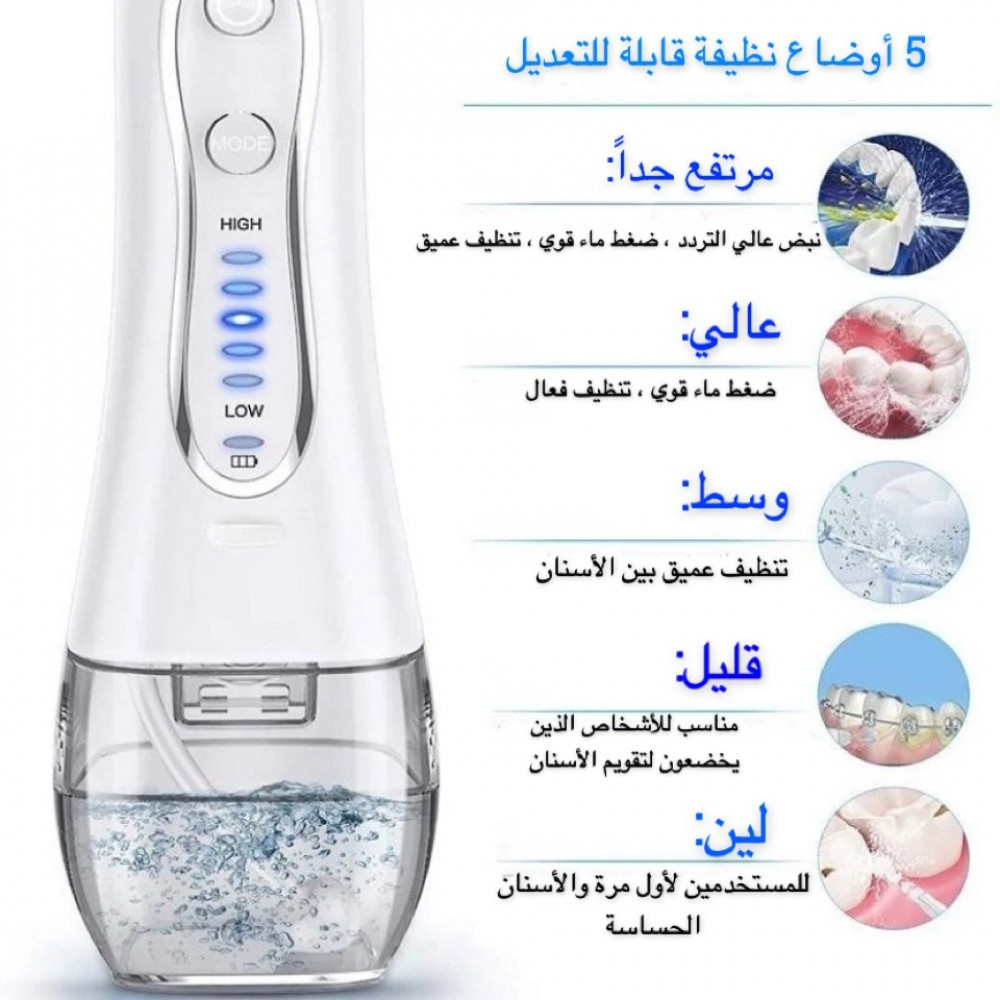 احتياطات مهمة عند استخدام المنتجات الكهربائية ، خاصةً عند وجود أطفال ، يجب دائمًا اتباع احتياطات السلامة الأساسية ، بما في ذلك ما يلي: اقرأ جميع التعليمات قبل الاستخدام. خطر: لتقليل مخاطر الصعق بالكهرباء: لا تلمس الشاحن ويداك مبتلة. افحص سلك الشاحن بحثًا عن التلف قبل الاستخدام الأول وأثناء عمر المنتج. استخدم هذا المنتج فقط كما هو مبين في هذه التعليمات أو على النحو الموصى به من قبل طبيب الأسنان الخاص بك. استخدم فقط النصائح والملحقات التي أوصت بها H2ofloss ،. لا تدخل أي جسم غريب في أي فتحة بالمنتج. احتفظ بوحدة الشحن والسلك بعيدًا عن الأسطح الساخنة. لا تستخدم هذا المنتج في الهواء الطلق. لا تستخدم اليود أو المحلول الملحي أو الزيوت الأساسية المركزة غير القابلة للذوبان في الماء في هذا المنتج. يمكن أن يؤدي استخدام هذه العناصر إلى تقليل الأداء وتقليل عمر المنتج. املأ الخزان بالماء أو أي محلول آخر موصى به من قبل أخصائي الأسنان فقط. قم بإزالة أي مجوهرات عن طريق الفم قبل استخدام هذا المنتج لا تستخدمه إذا كان لديك جرح مفتوح في لسانك أو في فمك.