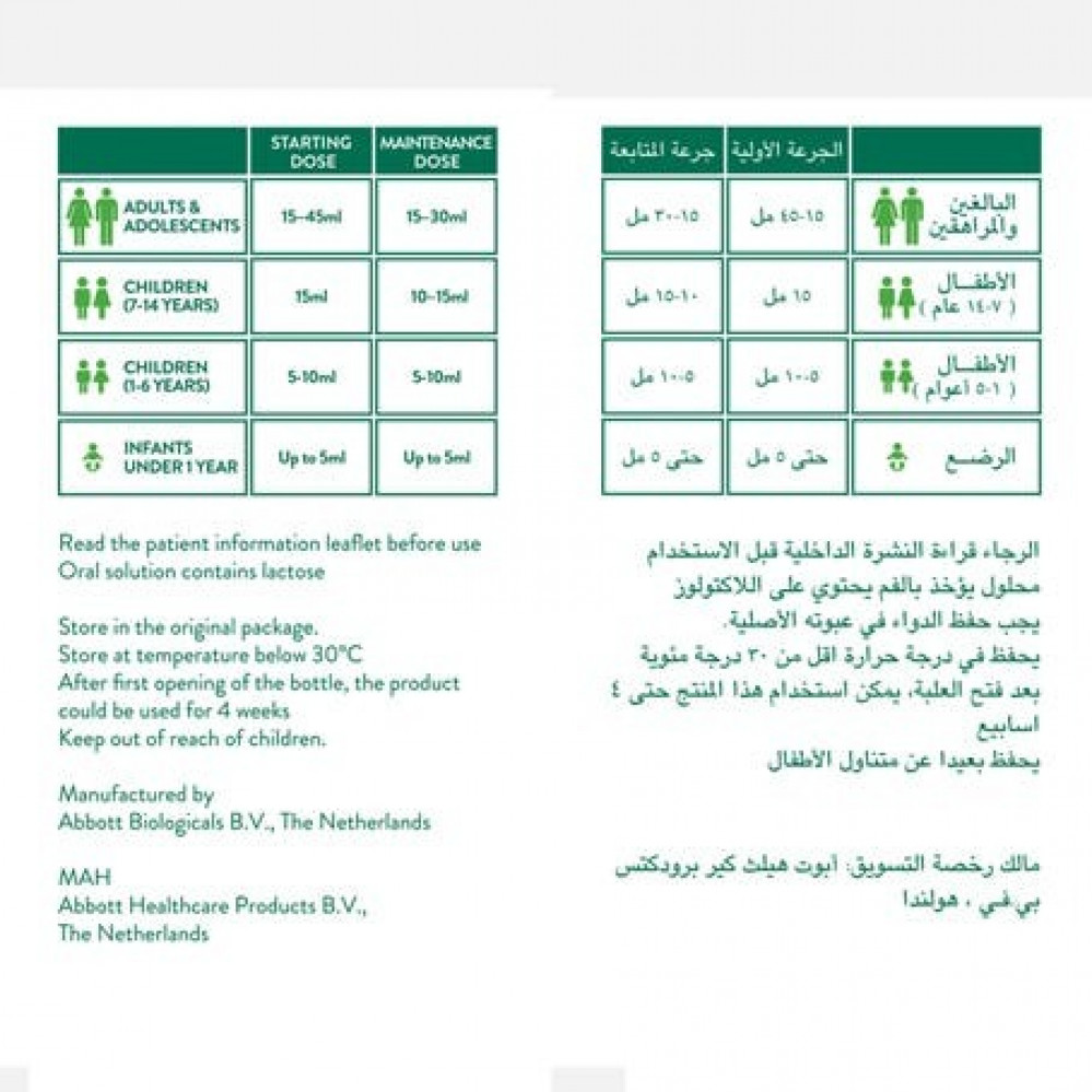الجرعة الأولية الموصى بها هي 30-45 مل عن طريق الفم ثلاث إلى أربع مرات يوميًا تليها جرعة مداومة يتم تعديلها حسب استجابتك حتى تبدأ في إنتاج مرتان أو ثلاث مرات براز يوميًا.