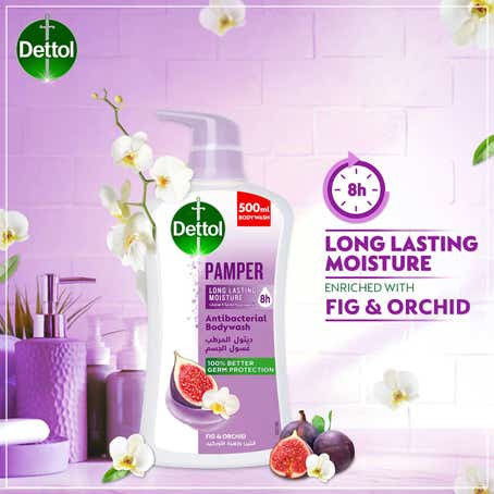 دع همومك وراءك مع حمام منعش مفعم بأفضل جل للاستحمام. ديتول يامير (المدلل) غسول الجسم وجل الاستحمام يضمن الحفاظ على صحتك دائمًا من خلال منحك حماية أفضل من الجراثيم بنسبة 100٪ مقارنة بالمنتجات الغير مضادة للبكتيريا ، عندما تم اختباره ضد البكتيريا. يجمع غسول الجسم بين الحماية الموثوقة من الجراثيم من ديتول ورائحة التين والأوركيد لحماية بشرتك ومساعدتك أيضا على الاسترخاء. يحافظ ديتول جل الاستحمام على درجة حموضة بشرتك مما يجعل البشرة تشعر بالصحة والنعومة. جل الاستحمام المضاد للبكتيريا يوفر لك الحماية من الرائحة الكريهة لمدة 8 ساعات كما أنه خالي من التراي كلو كاربان والتراي كلوسان للحفاظ على صحة أسرتك ونظافتها. تم اختبار هذا المنتج من قبل أطباء الجلدية.
