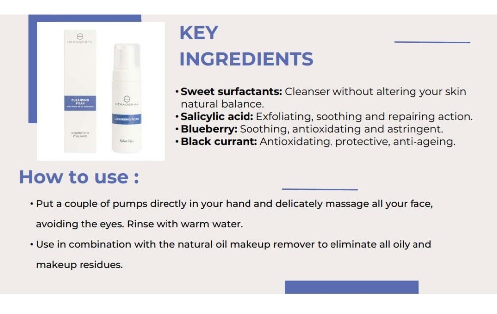 تساعد هذه الرغوة على تنظيف وجهك بشكل فعال ودقيق في الصباح ينظف كل الشوائب المتراكمة أثناء الليل وفي المساء يساعد على إزالة جميع بقايا المكياج والأوساخ الماراكة أثناء النهار بسهولة ودقة