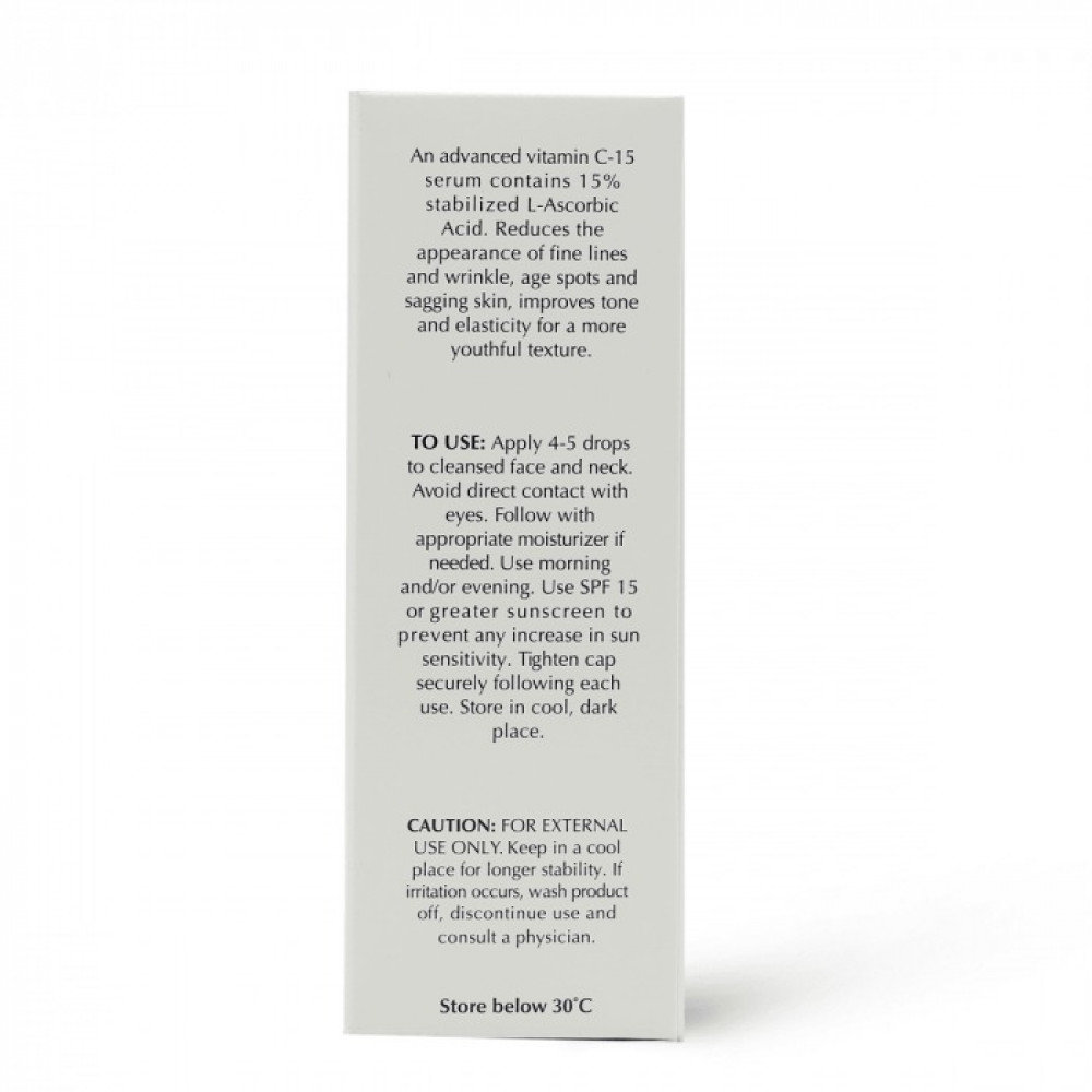 يحتوي مصل فيتامين C-15 المتقدم على 15٪ من حمض الأسكوربيك المستقر.
