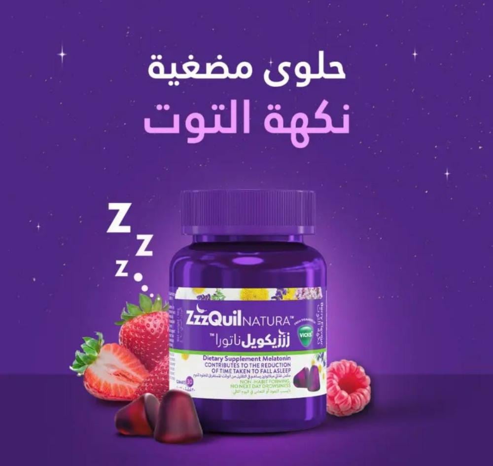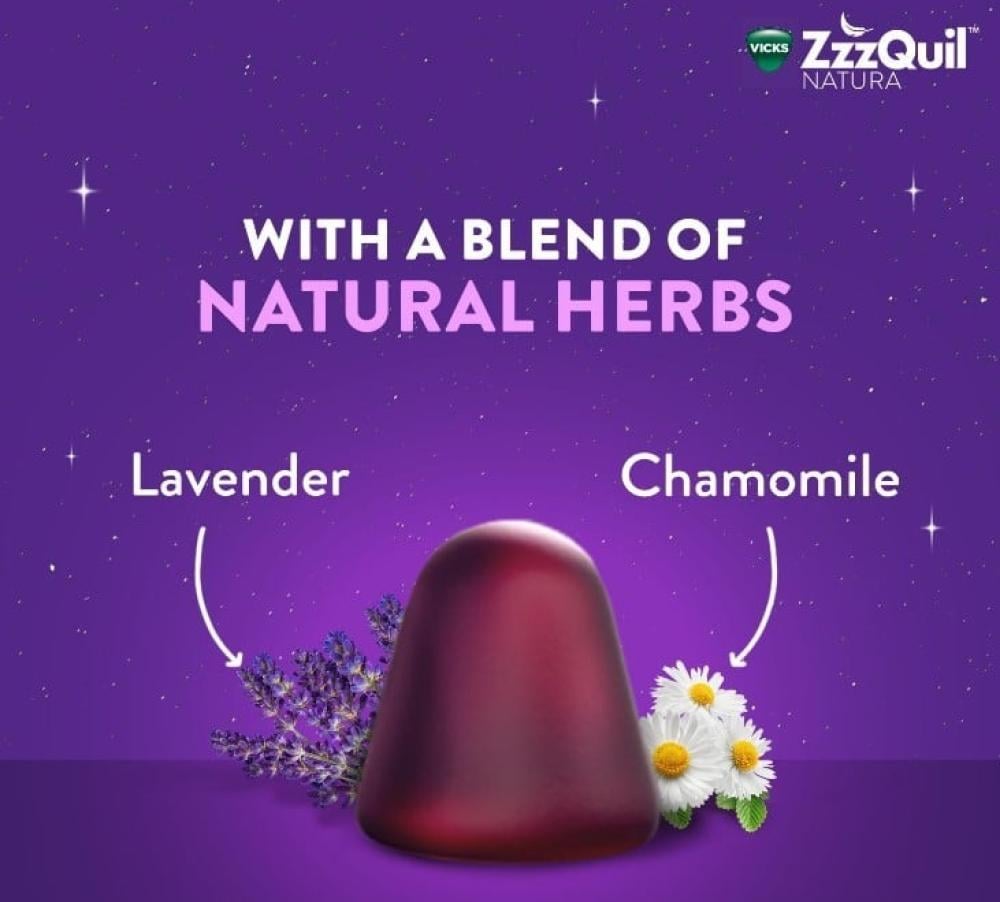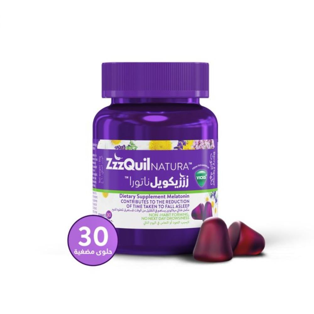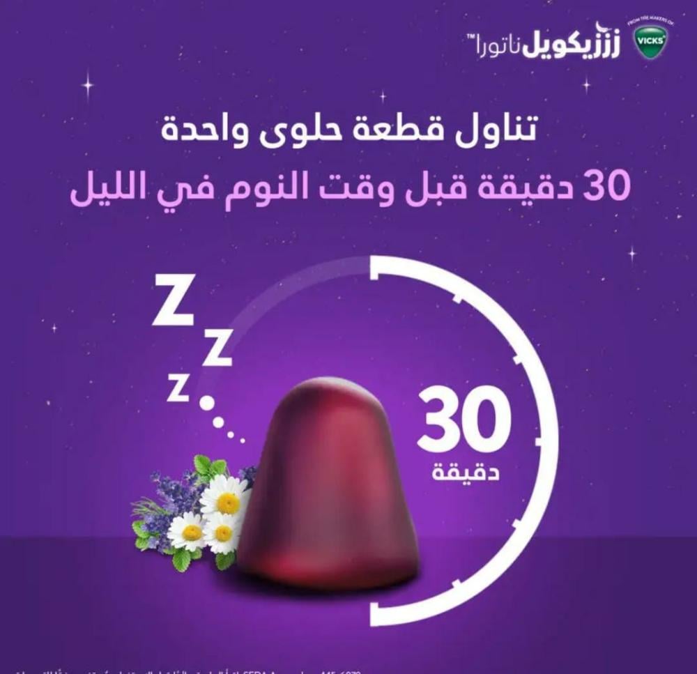 تساعدك على النوم بسرعة: تحتوي علكات Vicks Zzzquil Natura على جرعة مثالية 2 ملغ من الميلاتونين، التي تهدف إلى تكملة الإنتاج الطبيعي لجسمك لتغفو بسرعة.