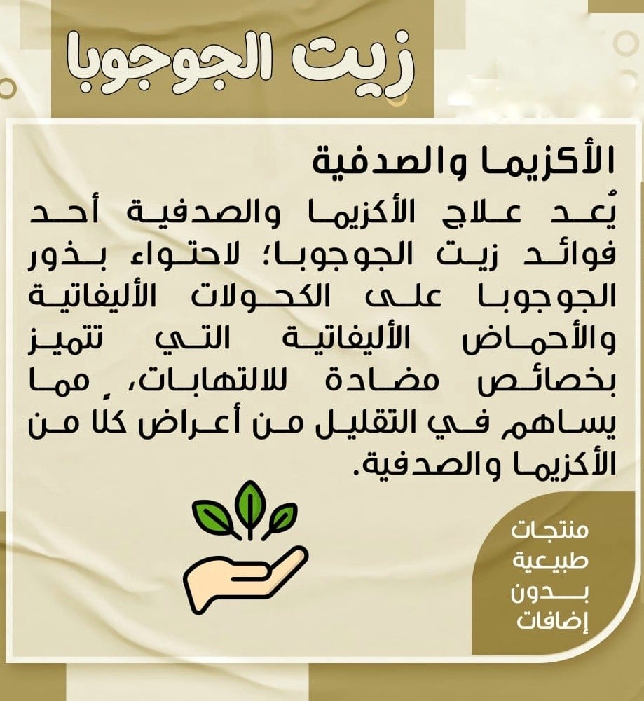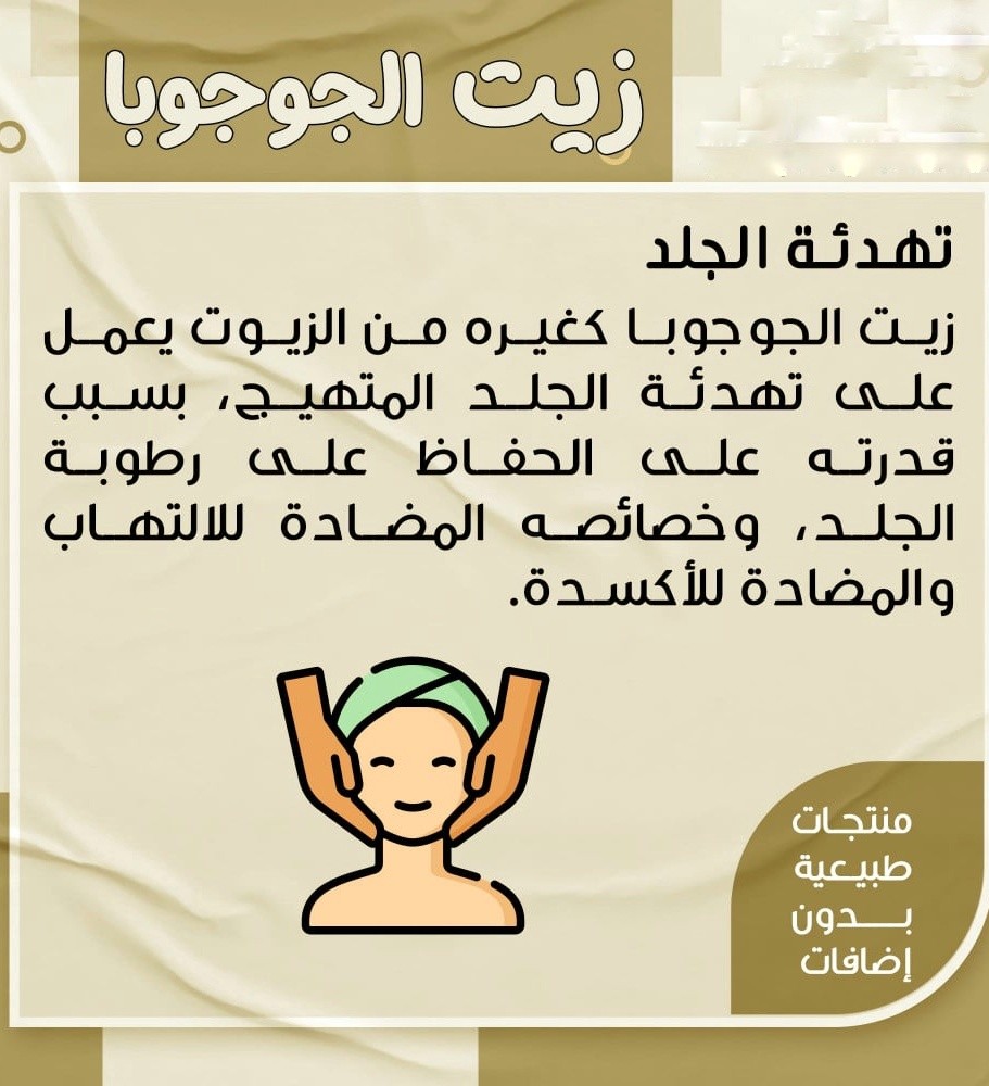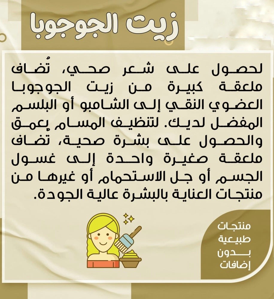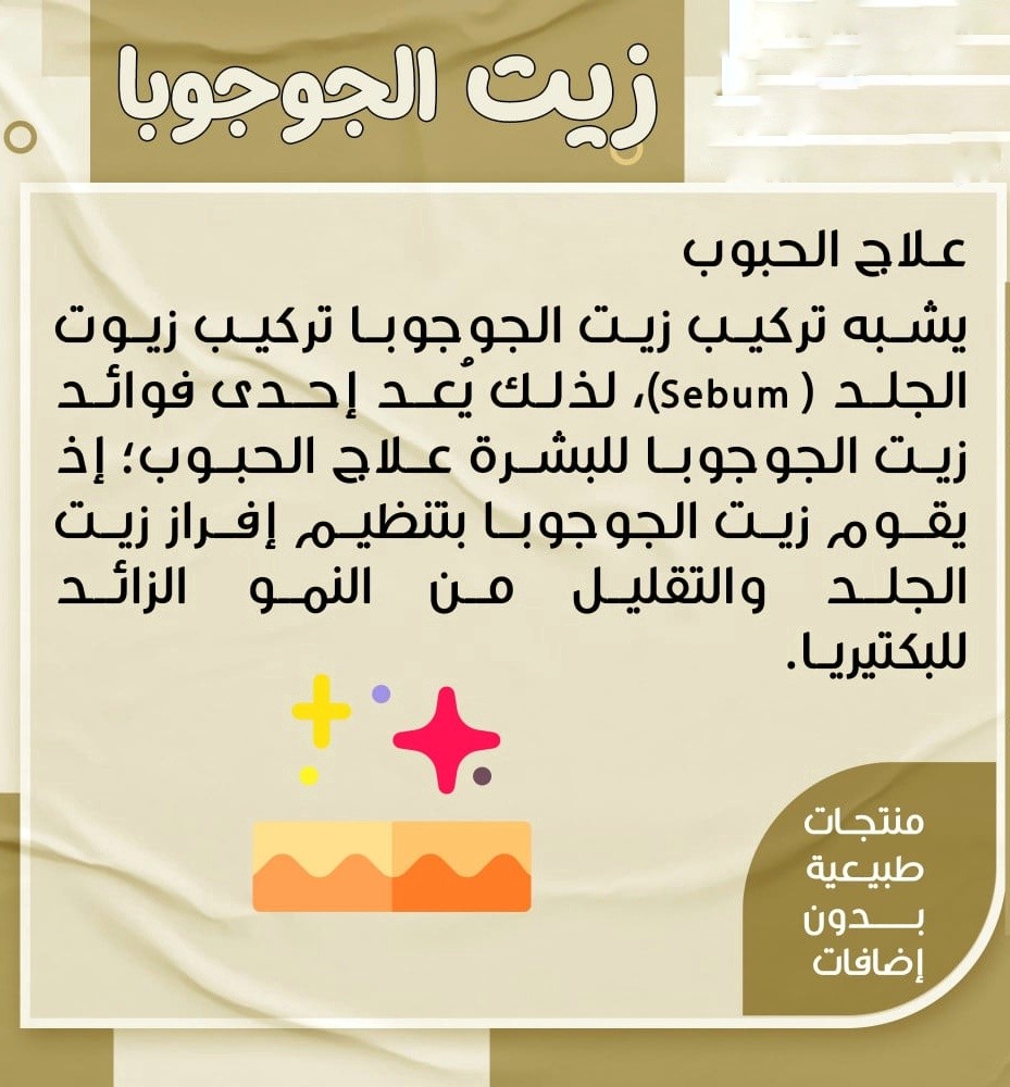 مستمد عضوي من بذرة (Simmondsia تشينينسيس) شجيرة الجوجوبا ويعد واحدا من الزيوت ومستحضرات التجميل الأكثر شعبية المتاحة اليوم. بفضل خواصه التي تجعله مثاليا لجميع أنواع البشرة والشعر، وهو الاكثر شيوعا لتعزيز الشعر وليونته والجلد.
