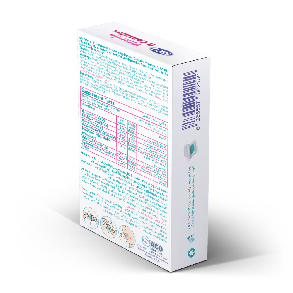 الوصف: ساكو فيتامين ب كومبلكس هو مكمل غذائي متكامل يحتوي على مجموعة من فيتامينات ب الضرورية لصحة الجسم. يشمل هذا المنتج فيتامينات B1 (الثيامين)، B2 (الريبوفلافين)، B3 (النياسين)، B5 (حمض البانتوثنيك)، B6 (البيريدوكسين)، B9 (حمض الفوليك)، B12 (السيانوكوبالامين)، والبيوتين. تأتي هذه الفيتامينات في شكل شرائح سريعة الذوبان توضع على اللسان، مما يسهل امتصاصها بسرعة.
