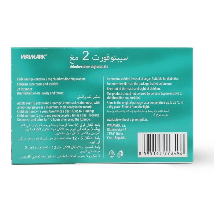 - سبتوفورت 2 ملغ معينات - 24 قرص سبتوفورت 2 ملغ يستخدم للعلاج الموضعي لالتهاب اللثة والتهابات الفم والقروح والالتهابات الفطرية والتهاب تجويف الفم نتيجة إجراءات طب الأسنان والتهاب اللسان واللوزتين والبلعوم الأنفي للحفاظ على النظافة.