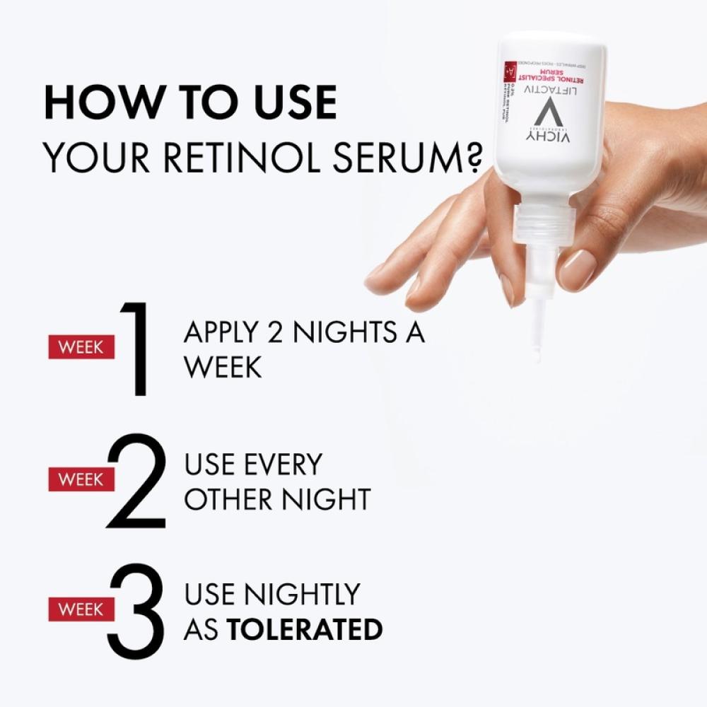 يُنصح باستخدامه كسيروم. اضغطي على الموزع بلطف للحصول على جرعة مناسبة. ضعي عدة قطرات على وجه نظيف وجاف في المساء قبل وضع المرطّب، وتجنبي ملامسته للعينين. إرشادات الاستخدام: الأسبوع 1: ضعيه مرتين في الأسبوع. الأسبوع 2: استخدميه مرة كل يومين. الأسبوع 3: استخدمه كل ليلة حسب التحمل، في حالة حدوث أي تهيجات للبشرة، قللي من الاستخدام و/أو الكمية. تأكدي دائمًا من ترطيب بشرتك جيدًا.