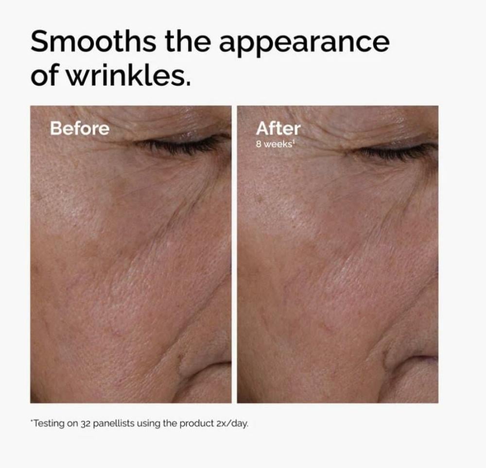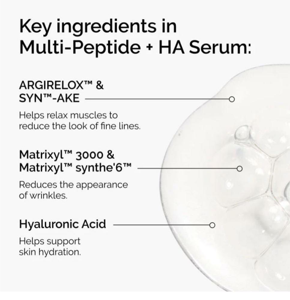 سيروم متعدد الببتيدات + حمض الهيالورونيك هو تركيبة شاملة تدعم علامات تقدم السن ، تجمع بين تقنيات متعددة للمساعدة في معالجة علامات شيخوخة البشرة المبكرة الشائعة، بما في ذلك مظهر الخطوط الدقيقة والشعور بمرونة البشرة وتماسكها . باستخدام أربع تقنيات ببتيدية مدروسة جيدًا - SYN™-AKE، وMatrixyl™ synthe'6™، وMatrixyl™ 3000، وARGIRELOX™ - إلى جانب الأحماض الأمينية، ومركّبات حمض الهيالورونيك المتعددة، يُقلّل هذا السيروم متعدد الببتيدات من ظهور التجاعيد حول العينين، ويُحسّن مرونة البشرة، ويُعزّز تماسكها.
