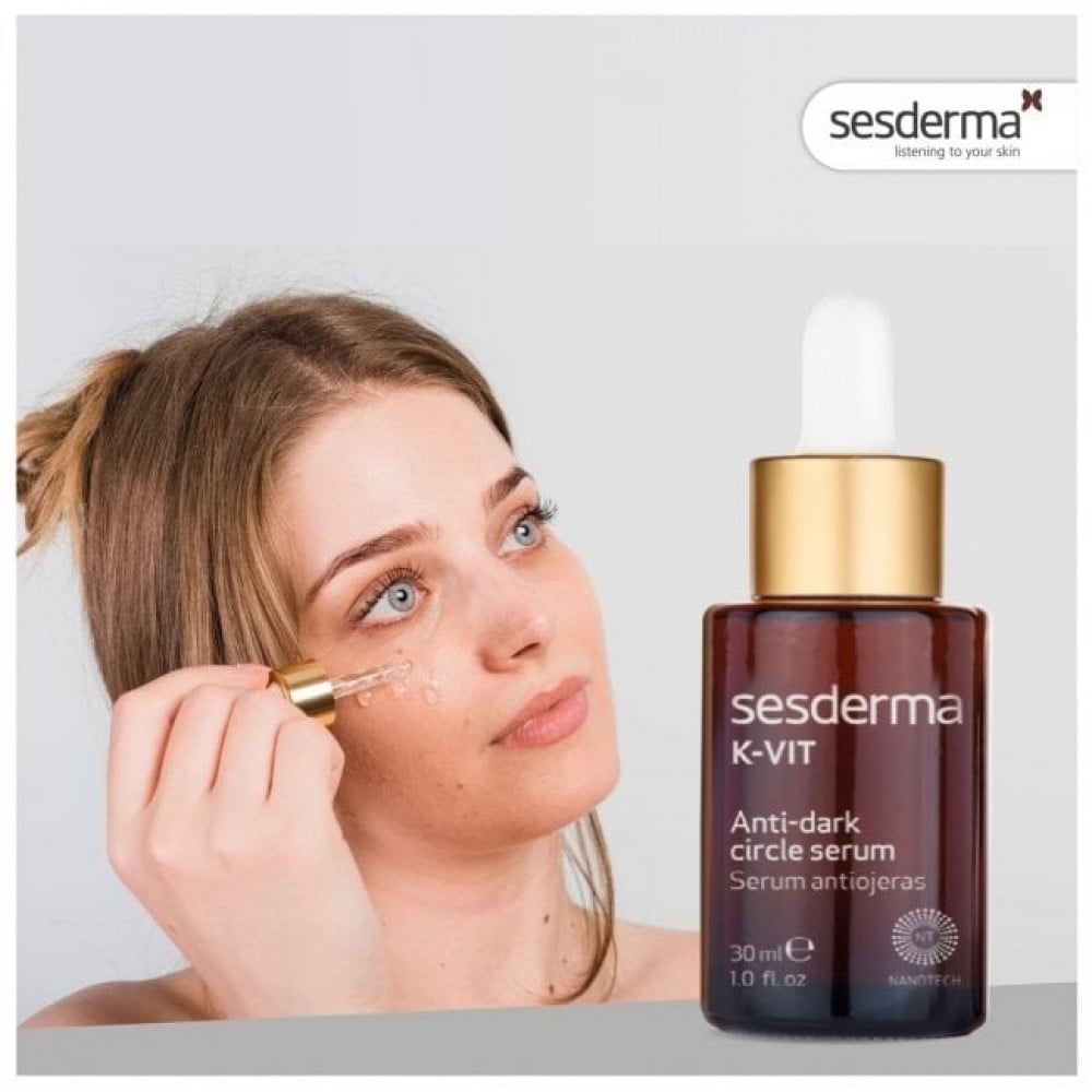 ضعي Sesderma K-Vit Anti-Dark Circles Serum Clarifying صباحًا ومساءً على البشرة النظيفة والجافة في منطقة محيط العين. اضغط برفق حتى يتم امتصاص المنتج.