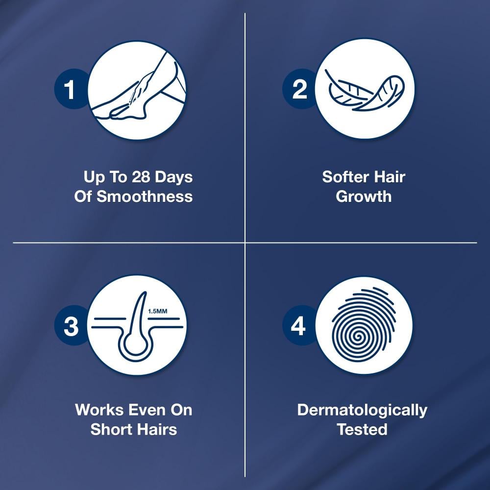 تزيل كل الشعر من الساقين والذراعين والإبطين وجميع أنحاء الجسم حتى أقصر الشعيرات، ولا يظهر لمدة تصل الى أربعة أسابيع.