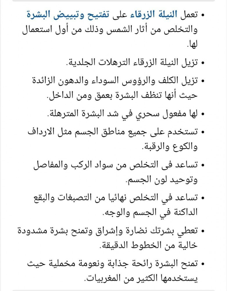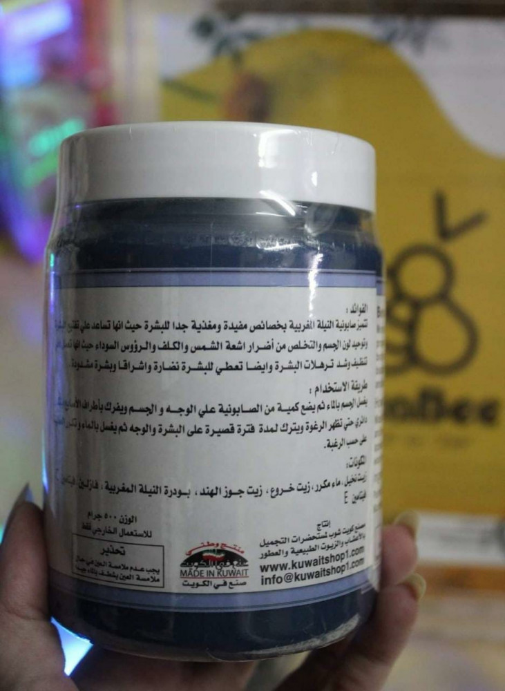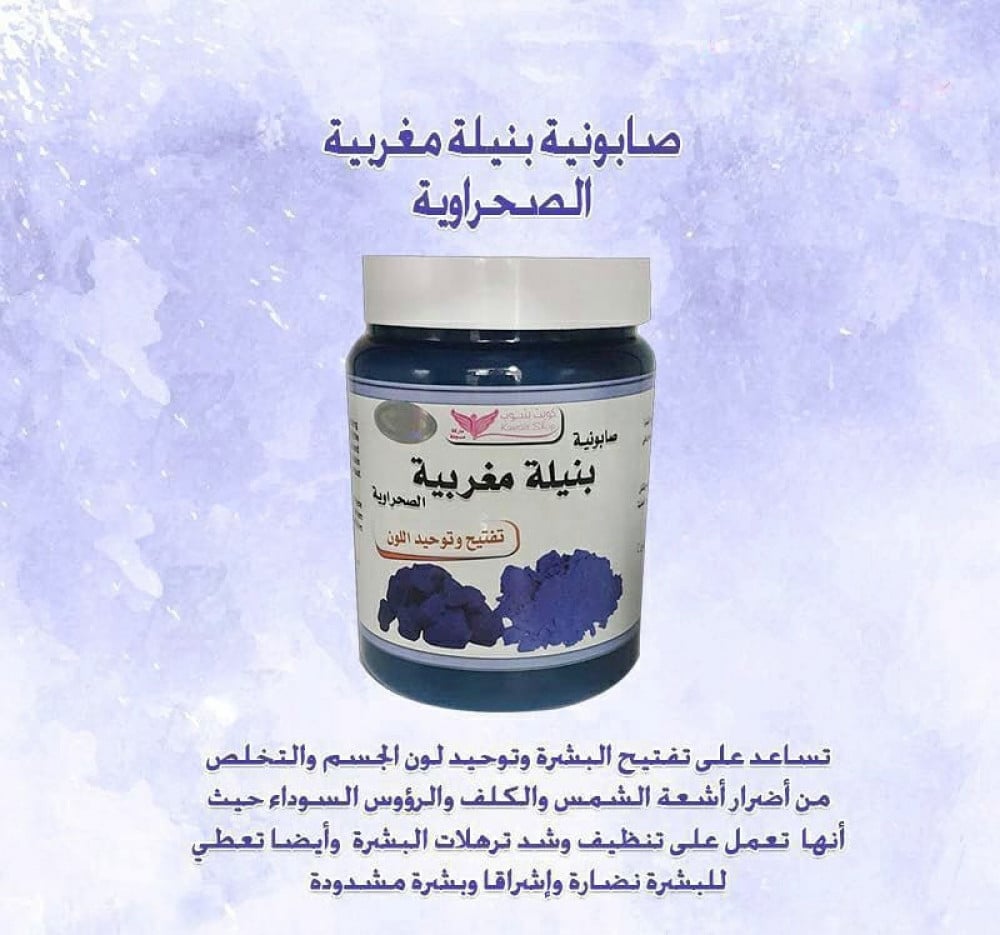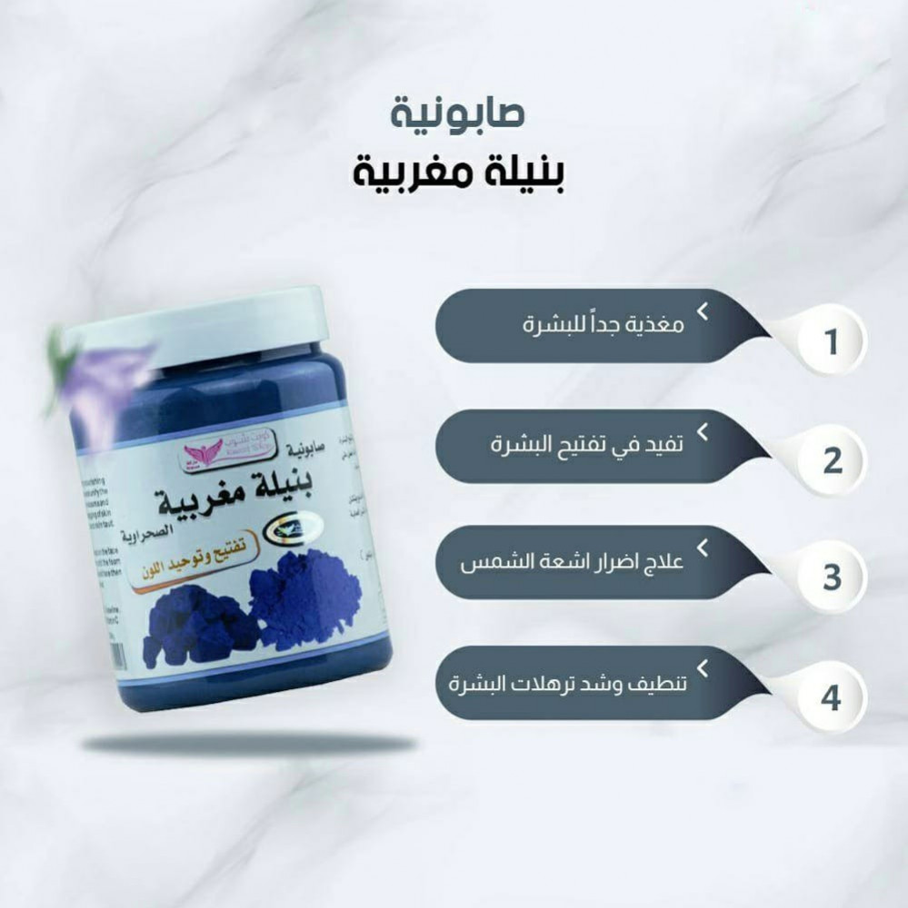 صابونية النيلة المغربية لتبييض الوجة والجسم والاكواع والركب والاماكن الحساسة ، تعطي شعور منعش ونعومة فائقة للجسم تفتح مسامات الجلد وتزود البشرة بالترطيب اللازم وتقضي على البقع الداكنة من كل مناطق الجسم والوجه