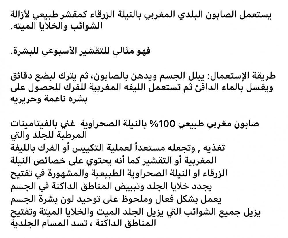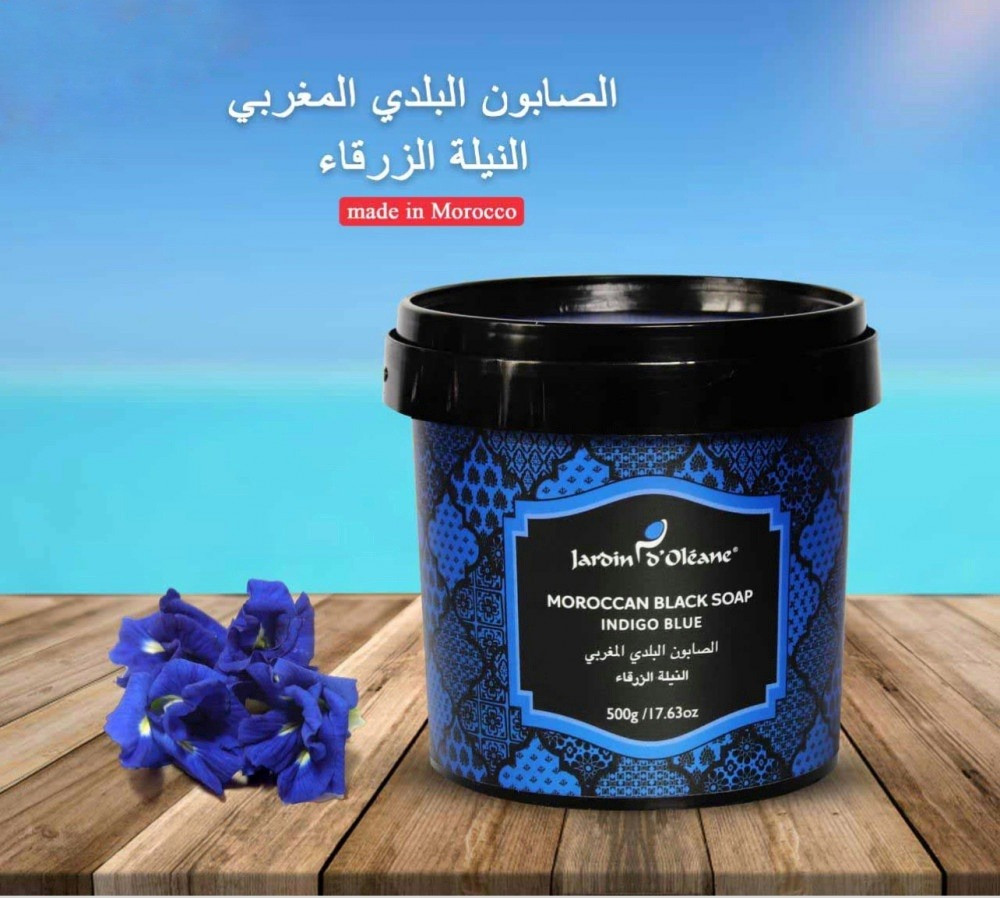 يستعمل الصابون البلدي المغربي بالنيلة الزرقاء كمقشر طبيعي لأزاله الشوائب والخلايا الميتة.