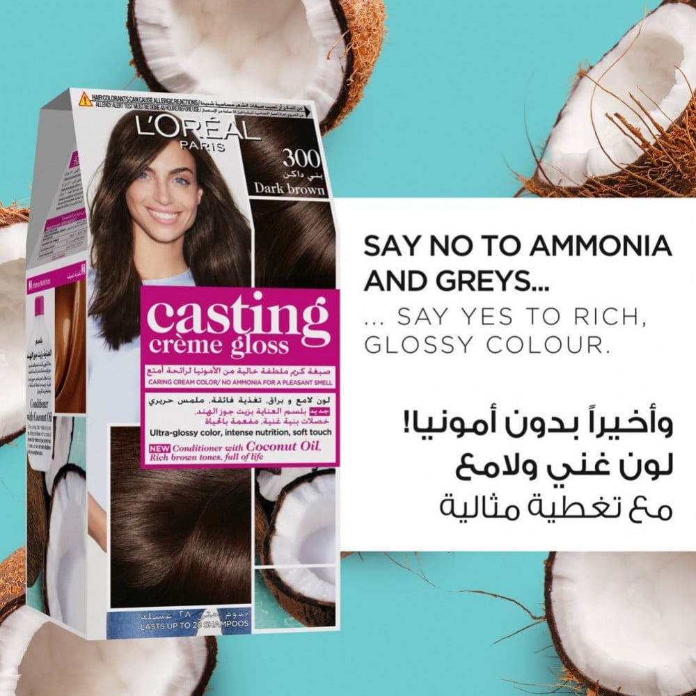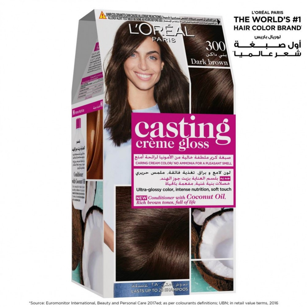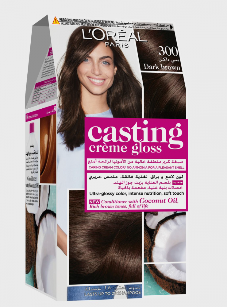 اول ظهور للشعر للرمادي؟ لا داعي للذعر! استسلم لكاستينج بتأثيره الظاهر الرائع الذي لا يقاوم. يمزج الشعر الرمادي للحصول على لون طبيعي يدوم حتى 28 غسلة بالشامبو. شعر لامع 4 مرات اكثر بفضل بلسم باث اوف بريلينس الجديد القابل لاعادة الاستخدام والغني بالرويال جيلي (60 مل). تغذية مكثفة لشعر ناعم حريري وسهل فك تشابكاته: المباراة المثالية للشعر الطويل الى الطويل جدًا! مثالي كأول لون يستخدم للشعر، تركيبته الكريم الخالية من الأمونيا تجعله سهل التطبيق ولا يتقطر.