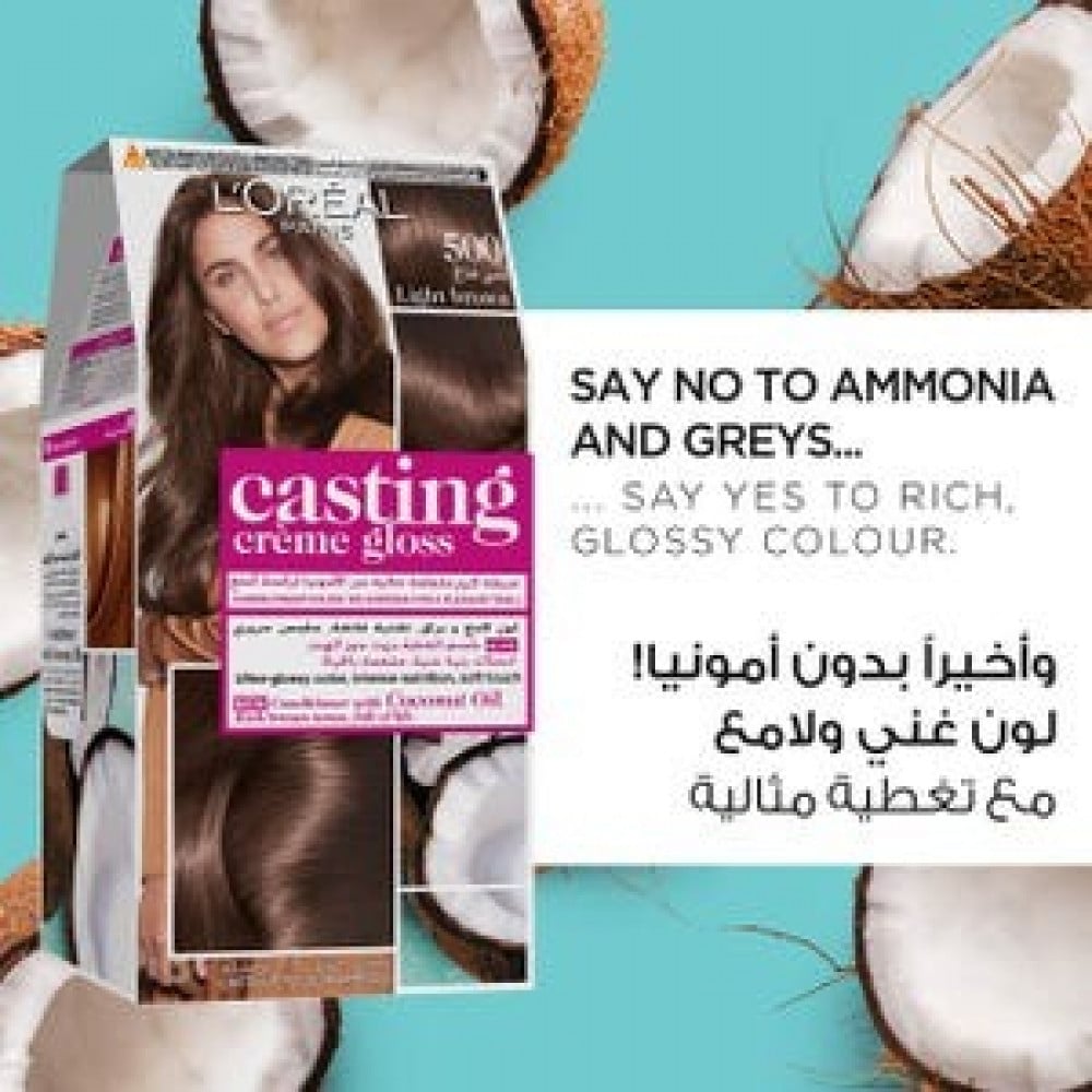 صبغة شعر كاستينج كريم جلوس من لوريال باريس هي صبغة شعر شبه دائمة تضيف لونًا طبيعيًا لشعرك. تركيبة كريم خالية من الأمونيا تم تصميمها لتمنحك لمعانًا غنيًا ومشرق يدوم حتى 28 غسلة شامبو.