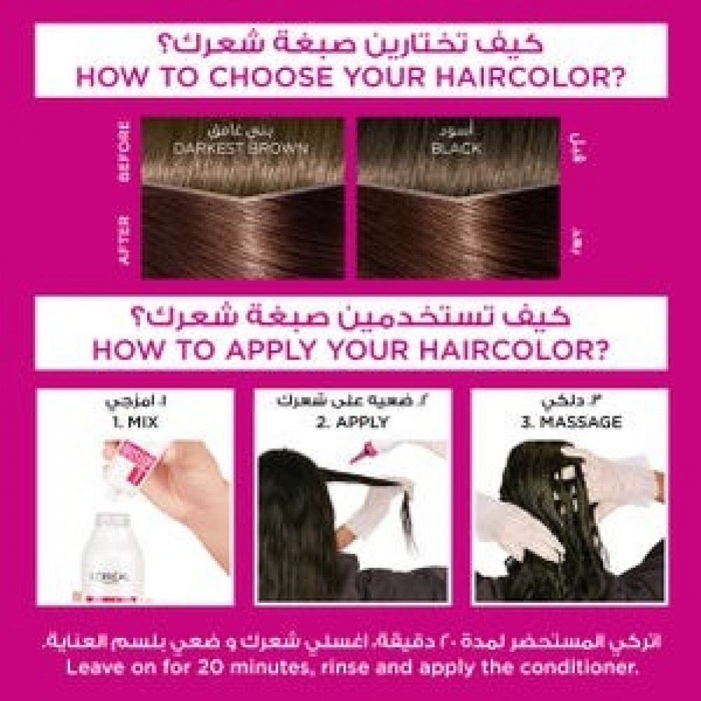 اختيار اللون المثالي لك: ستختلف نتيجة لون الشعر اعتمادًا على لون شعرك الطبيعي. إذا كنت حائرة بين درجتين من اللون، فإننا نوصي دائمًا باختيار اللون الافتح.