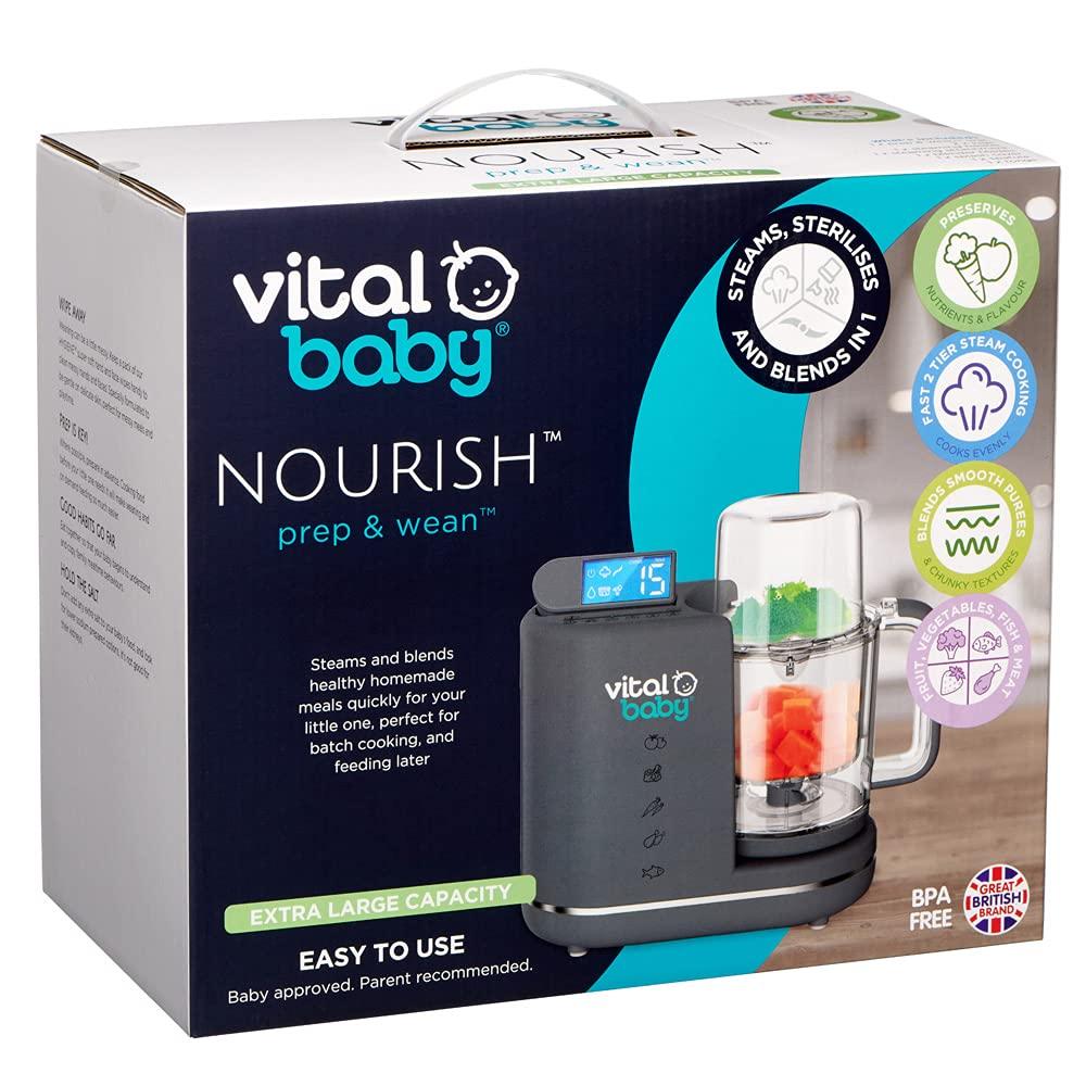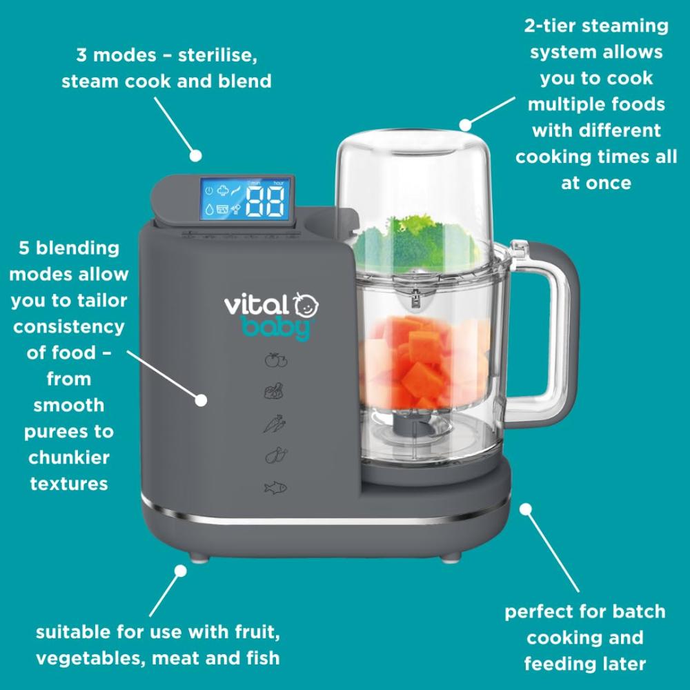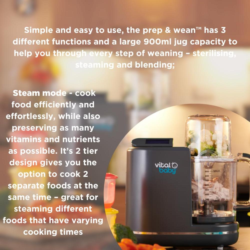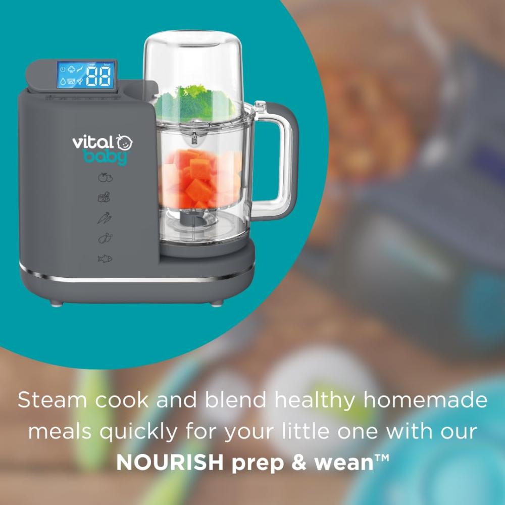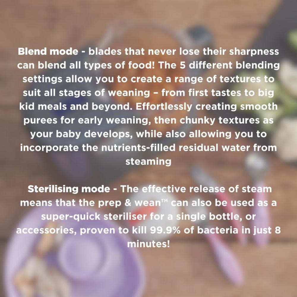 قم بالطهي بالبخار ومزج الوجبات المنزلية الصحية بسرعة لطفلك الصغير من خلال تحضير الطعام والفطام. بسيط وسهل الاستخدام، يحتوي التحضير والفطام على 3 وظائف مختلفة وسعة إبريق كبيرة 900 مل لمساعدتك في كل خطوة من خطوات الفطام والتعقيم والبخار والمزج؛ وضع البخار - طهي الطعام بكفاءة وبدون مجهود، مع الحفاظ على أكبر عدد ممكن من الفيتامينات والمغذيات. يمنحك تصميمه المكون من طبقتين خيار طهي طعامين منفصلين في نفس الوقت وهو رائع لتبخير الأطعمة المختلفة التي لها أوقات طهي مختلفة. وضع المزج - الشفرات التي لا تفقد حدتها أبدًا يمكنها مزج جميع أنواع الطعام! تتيح لك إعدادات المزج الخمسة المختلفة إنشاء مجموعة من القوام لتناسب جميع مراحل الفطام من المذاق الأول إلى وجبات الأطفال الكبار وما بعدها. اصنع مهروسًا ناعمًا للفطام المبكر، ثم قوامًا مكتنزًا مع نمو طفلك، مع السماح لك أيضًا بدمج الماء المتبقي المليء بالمغذيات من البخار. وضع التعقيم - يعني الإطلاق الفعال للبخار أنه يمكن أيضًا استخدام جهاز التحضير والفطام كمعقم فائق السرعة لزجاجة واحدة أو ملحقات، ثبت أنه يقتل 99.9% من البكتيريا في 8 دقائق فقط!