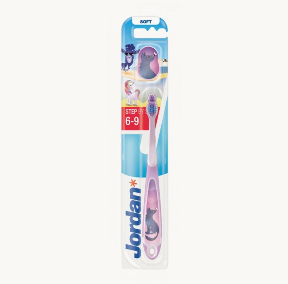 فرشاة أسنان جوردان ستيب للأطفال من عمر 6 إلى 9 سنوات تتميز بشعيرات مستديرة وكثيفة لتنظيف مثالي للأسنان المختلطة.