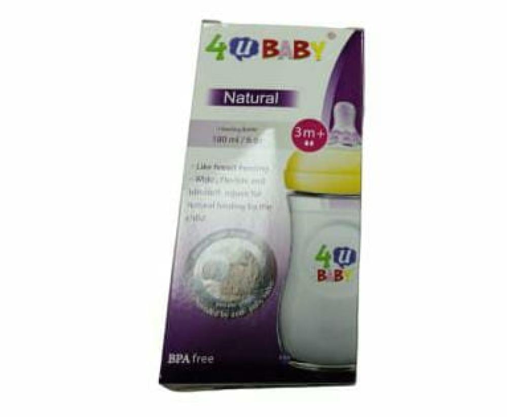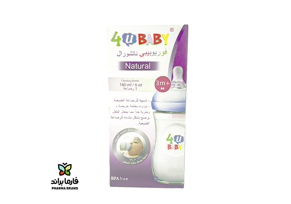 رضاعة فور يو بيبي (4U BABY) البلاستيكية سعة 180 مل، من نوع "ناتشورال" (Natural)، مصممة للأطفال من عمر 3 شهور فما فوق، تتميز بأنها آمنة وصحية (بولي بروبلين PP) وتساعد على تقليل المغص والغازات بفضل تصميمها الهلامي، ومناسبة للتغذية الصغيرة، ويمكن تعقيمها بسهولة