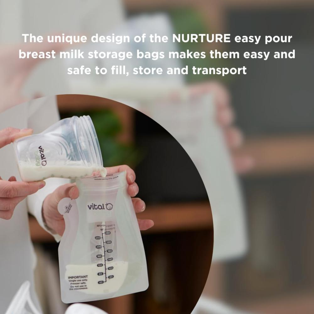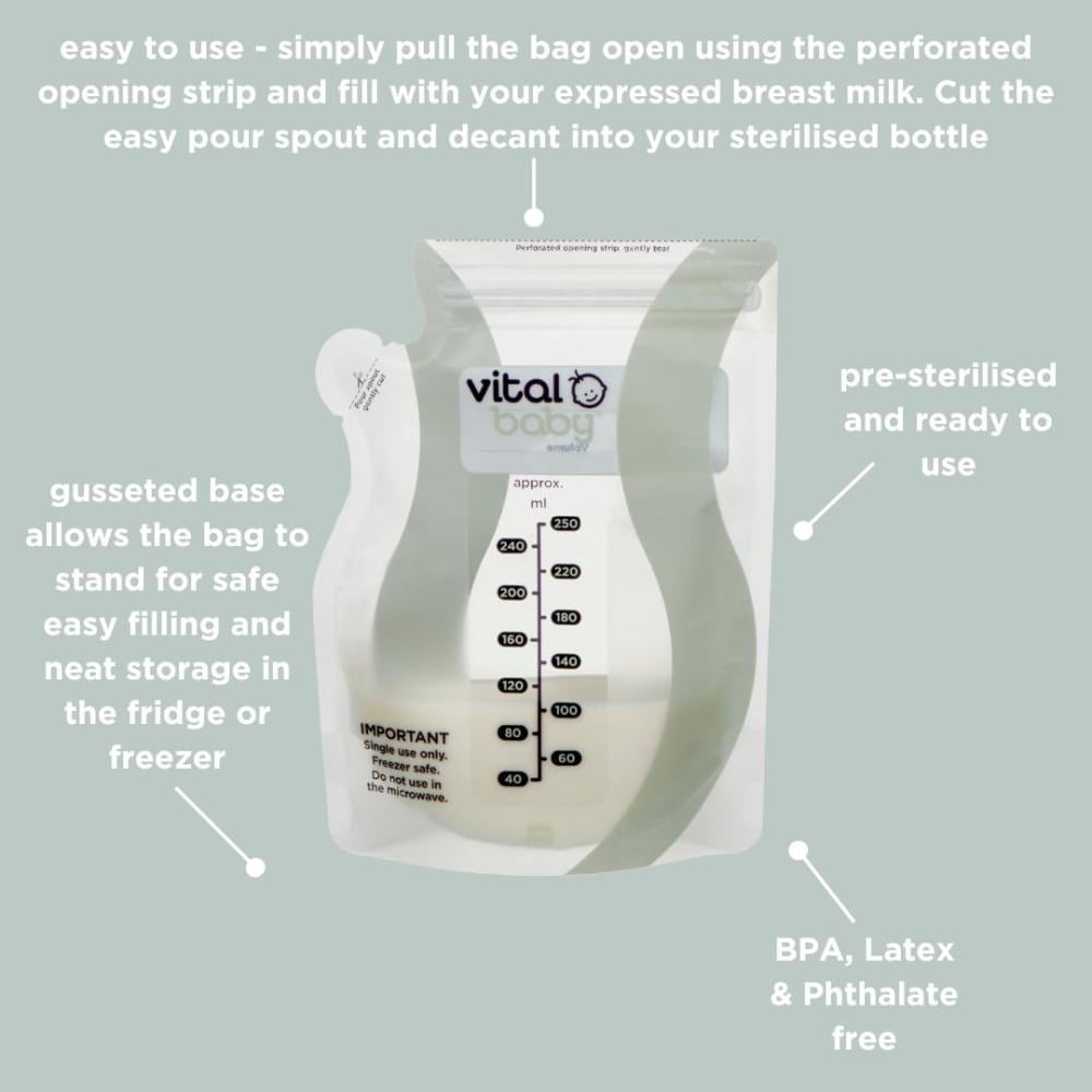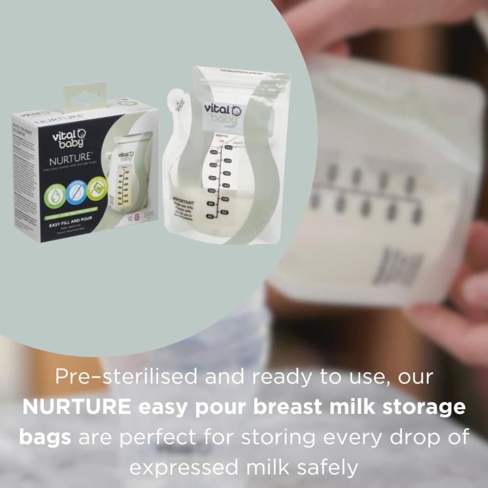 30 × أكياس تخزين حليب الثدي فايتال بيبي NURTURE سهلة الصب. فوهة سهلة الصب. قاعدة قائمة بذاتها. التصميم الفريد لأكياس تخزين حليب الثدي من فايتال بيبي nurture سهلة الصب تجعلها سهلة الملء والتخزين وآمنة للغاية في النقل. معقمة وجاهزة للاستخدام، أكياس تخزين حليب الثدي من نوع فايتال بيبي Nurture سهلة الصب مثالية لتخزين كل قطرة من الحليب المعبر بأمان وصحة. يضمن الإغلاق الآمن والمضاد للتسرب عدم فقدان قطرة من الحليب الثمين عند التخزين في الثلاجة أو الفريزر، بالإضافة إلى الرقبة العريضة والقاعدة القائمة بذاتها تضمن سهولة ملء كل كيس. ما عليك سوى إزالة العروة المثقوبة مسبقًا، ثم اسكب حليب الثدي الطازج على الفور، واحتفظ بالانتعاش بأمان باستخدام السحابة سهلة الاستخدام. تحتوي الحقيبة على علامات قياس ومساحة لتدوين التاريخ. يمكن وضع الحقيبة في الثلاجة أو الفريزر للتخزين. عندما تكونين مستعدة لاستخدام حليب الأم، هناك فوهة خاصة سهلة الصب. أعد فتح الكيس ببساطة عن طريق قصه على طول الخط المنقط، مما يضمن عدم سكب حليب الثدي الثمين على سحاب الإغلاق الذي تم التعامل معه أثناء التعبئة. هذا أيضًا يمنع التلوث المحتمل ويحافظ على مستوى عالٍ من النظافة بسهولة ودون عناء. يوجد 30 كيس × 250 مل في كل صندوق، لذلك يمكنك دائمًا الحصول على بعض حليب الثدي في متناول اليد عند الحاجة. معتمد من الأطفال. يوصى به الوالدين.