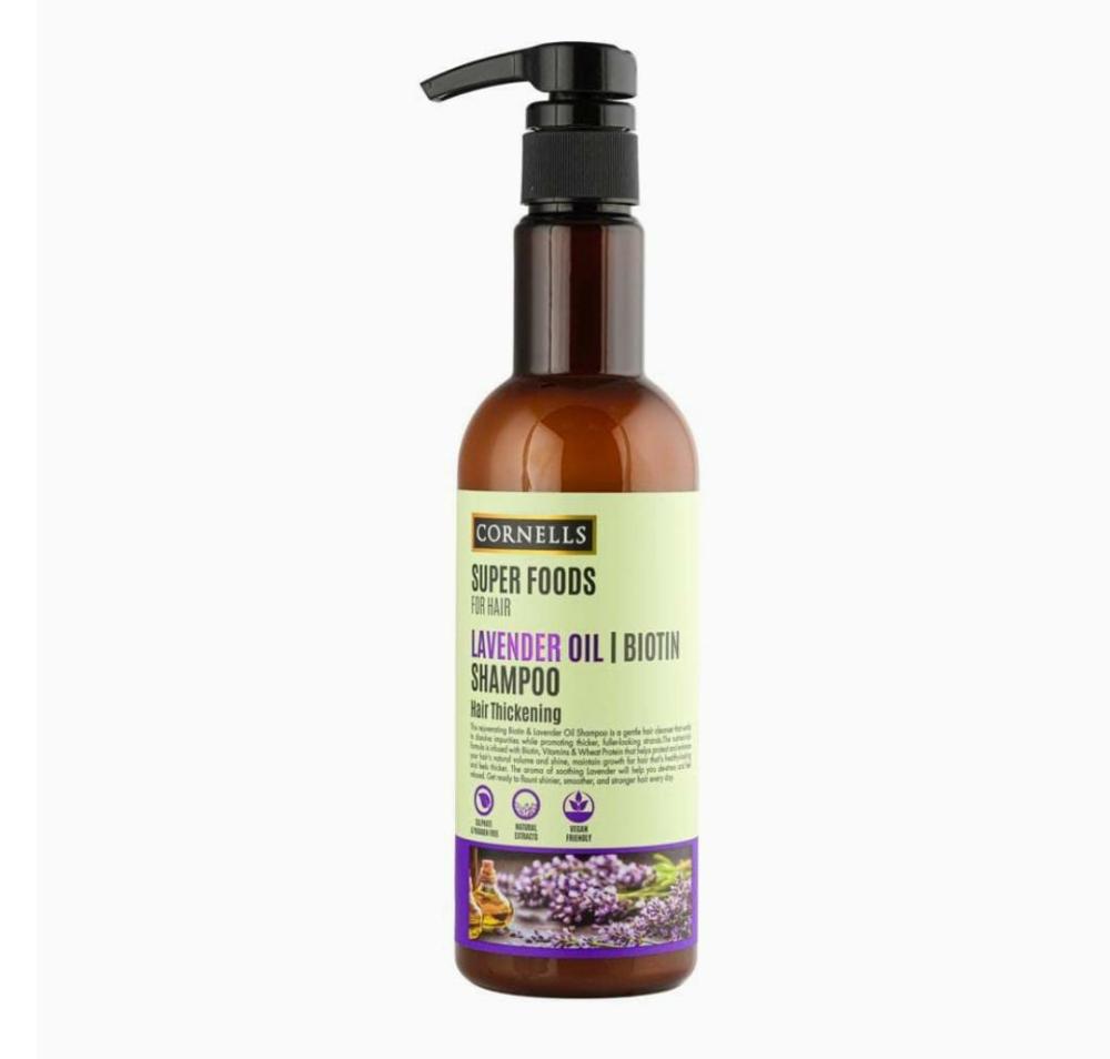 - شامبو زيت واللافندر من كورنيلز ينظف شعرك بلطف بينما يستعيد الترطيب الملائم لشعرك وفروة رأسك ويوفر تغذية فعّالة