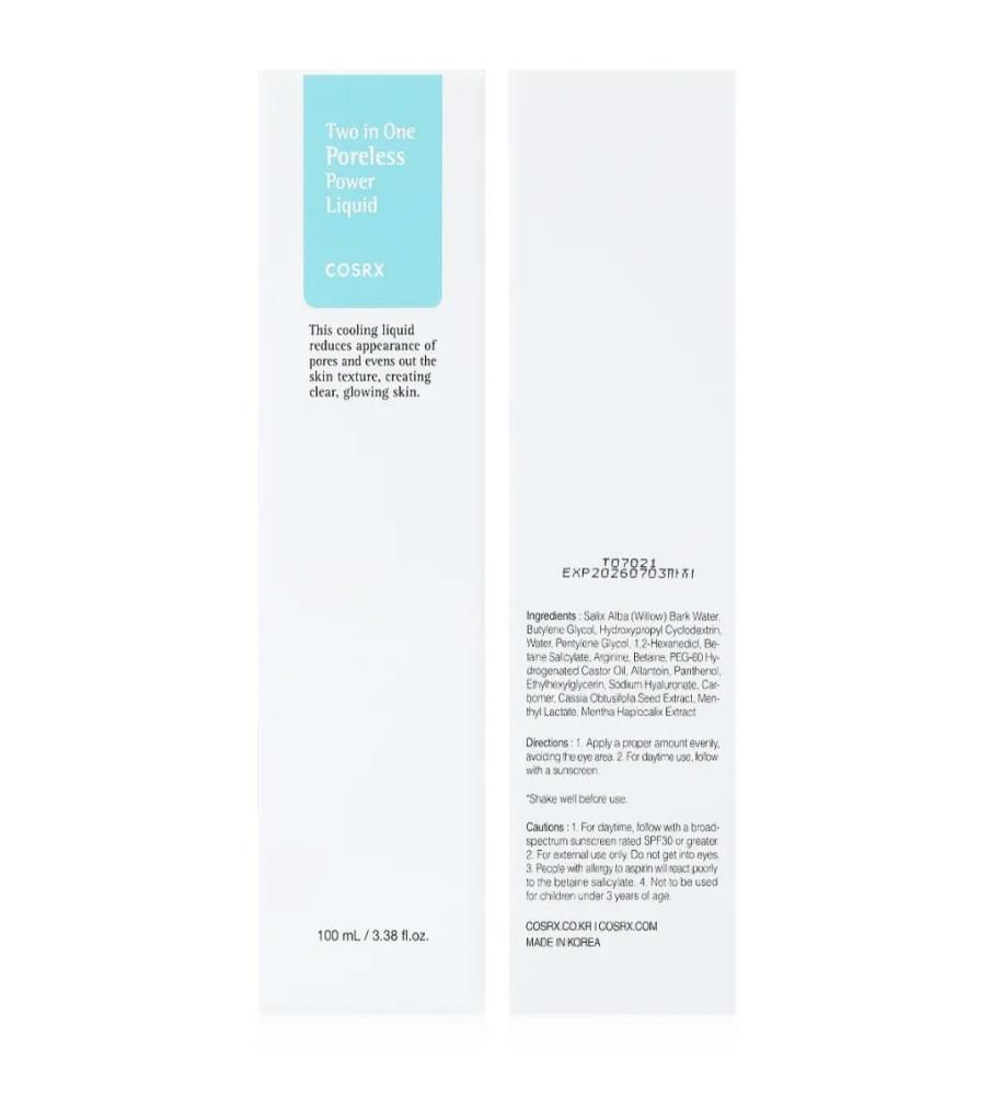 ماء لحاء الصفصاف، بوتيلين جليكول، هيدروكسي بروبيل سيكلوديكسترين، ماء، بنتيلين جليكول، 1،2-هيكسانيديول، ساليسيلات البيتاين، أرجينين، بيتاين، زيت الخروع المهدرج PEG-60، ألانتوين، بانثينول، إيثيل هكسيل جلسرين، هيالورونات الصوديوم، كاربومير، مستخلص بذور كاسيا أوبتوسيفوليا، لاكتات المينثيل، مستخلص النعناع هابلوكالكس.