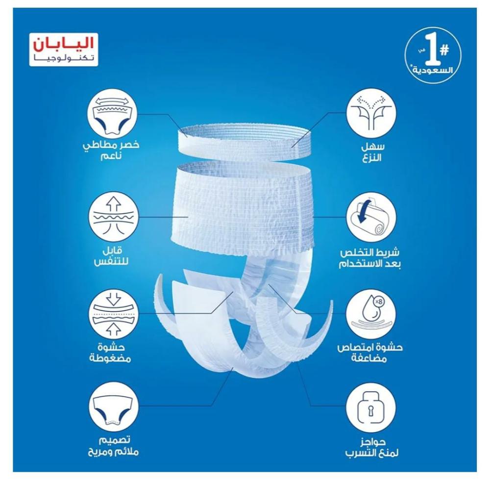 للاستخدام، اسحب الحفاض مثل الملابس الداخلية وتأكد من ملاءمة محكمة لمنع التسرب. قم بتغييرها عند الحاجة والتخلص من الحفاضات المستخدمة بشكل صحيح.
