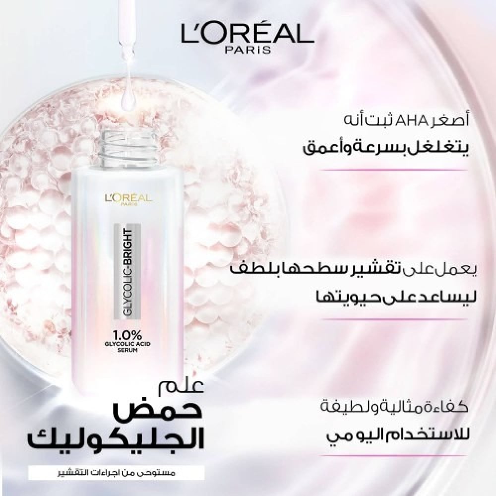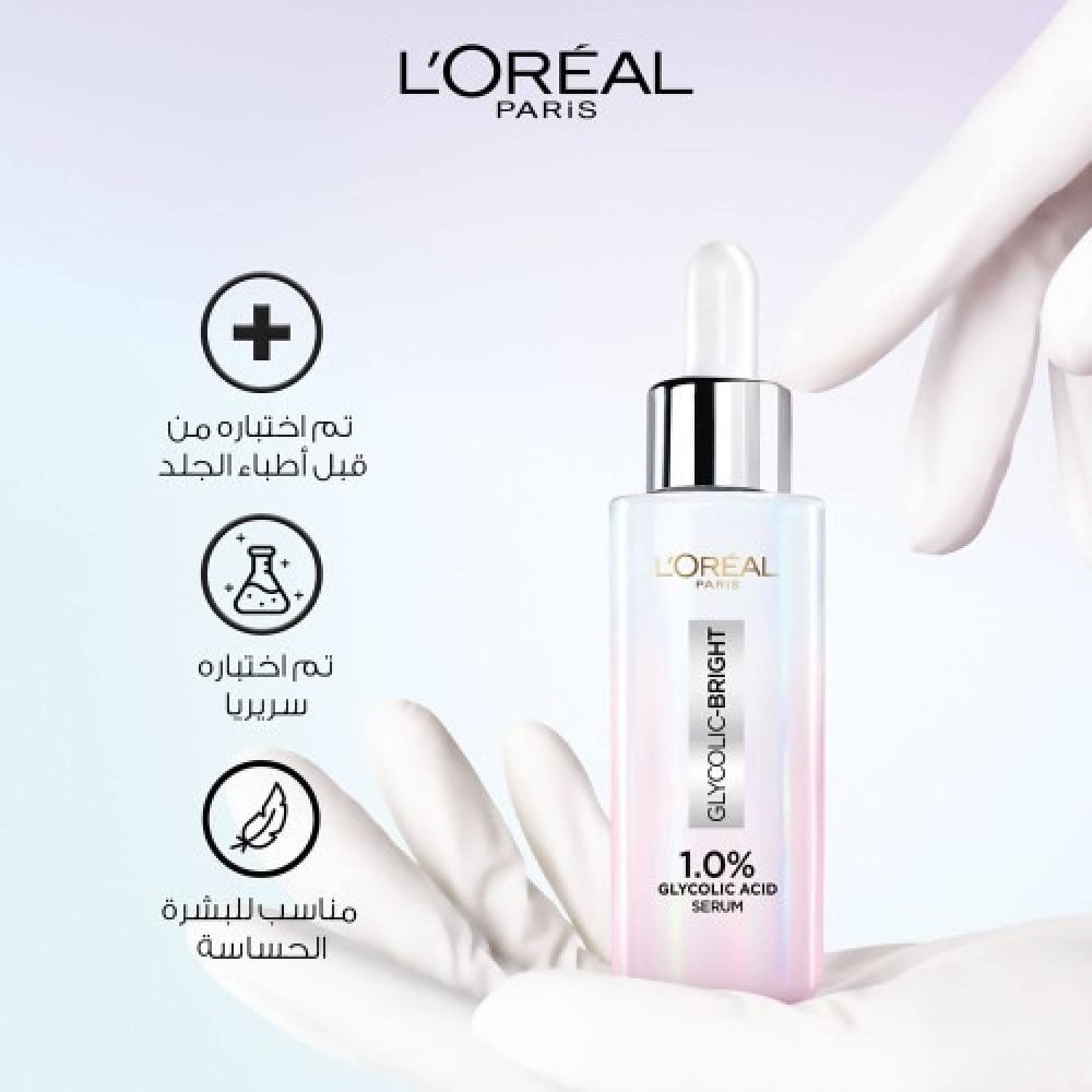 ابتكـرت مختبـرات لوريـال باريـس سـيروم GLYCOLIC BRIGHT لاشـراقة فوريـة مـع تركيز بنسبة %1.0 من حمض الجلايكوليك وقــد أثبتــت التجــارب الســريرية فعاليتــه فــي تعزيــز إشــراقة البشــرة وتخفيــف مظهر البقع الداكنة.