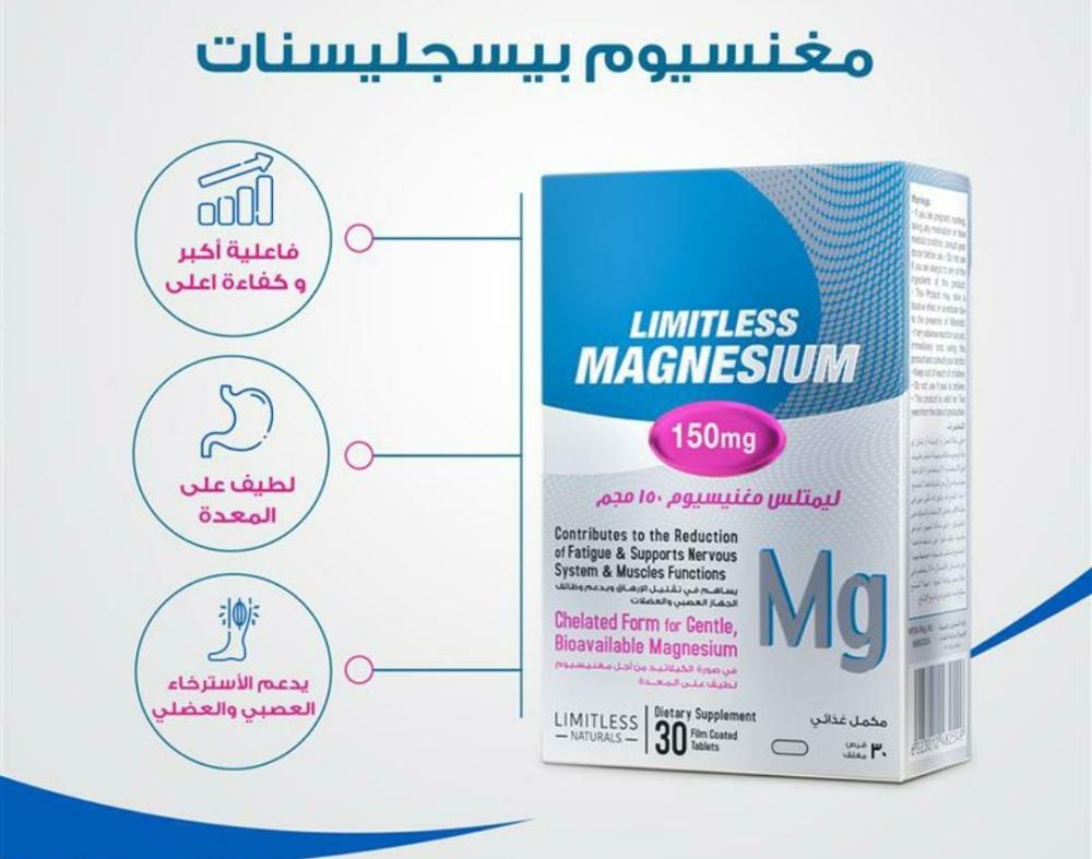 يحتوي على ١٥٠ مجم من مغنيسيوم بيسجليسينات، وهو أفضل شكل من المغنيسيوم لسهولة الامتصاص وفعالية أعلى، ولطف على المعدة.